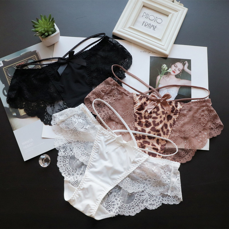 欧美细带印花女士系带豹纹蕾丝内裤女低腰日系女式三角裤