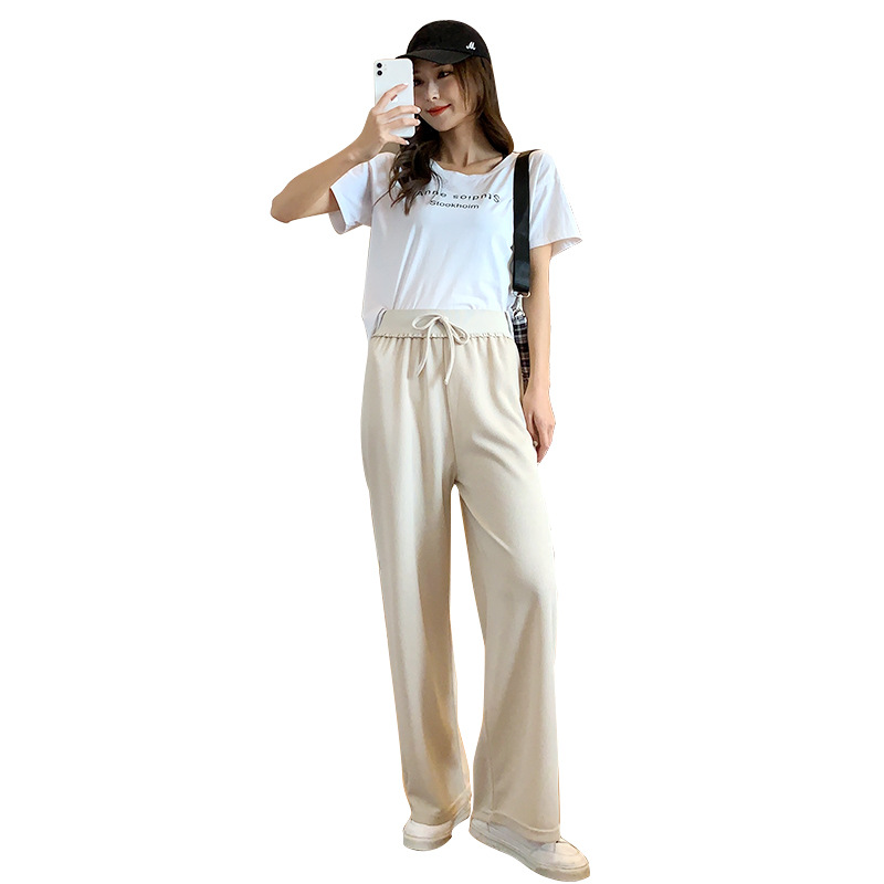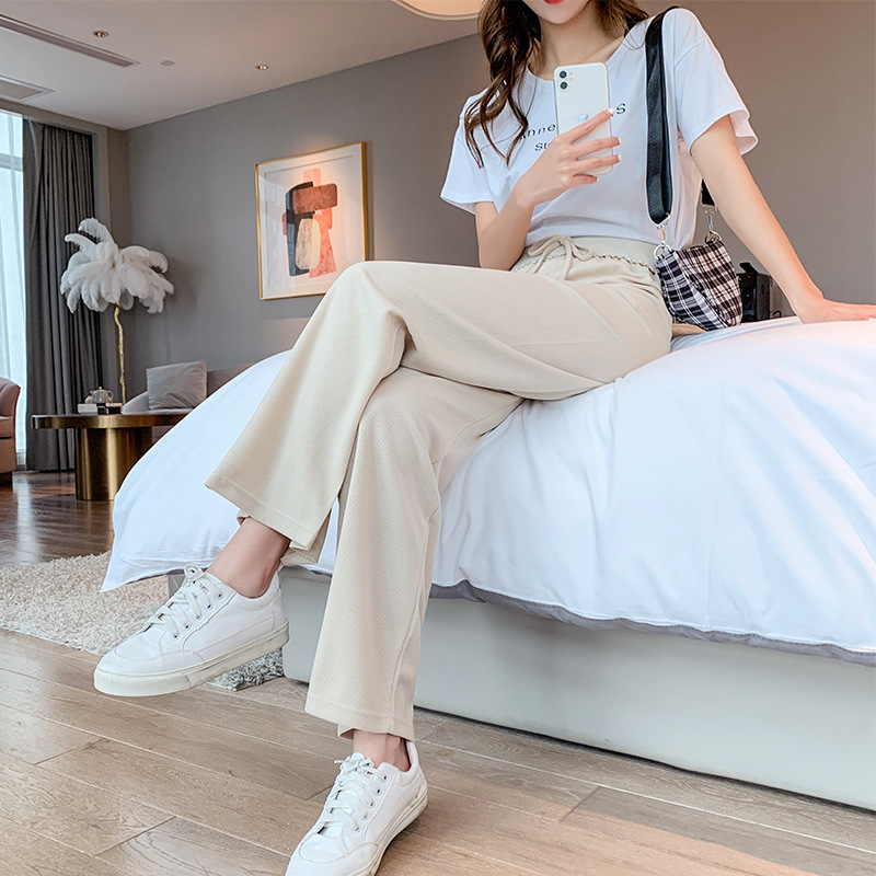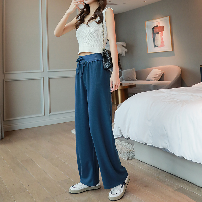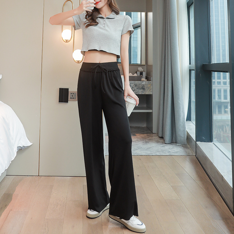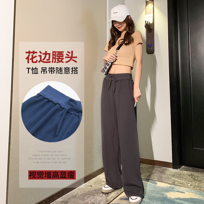 巴黎条阔腿裤垂坠感长裤小个子宽松显瘦拖地瘦瘦裤高腰花边休闲裤