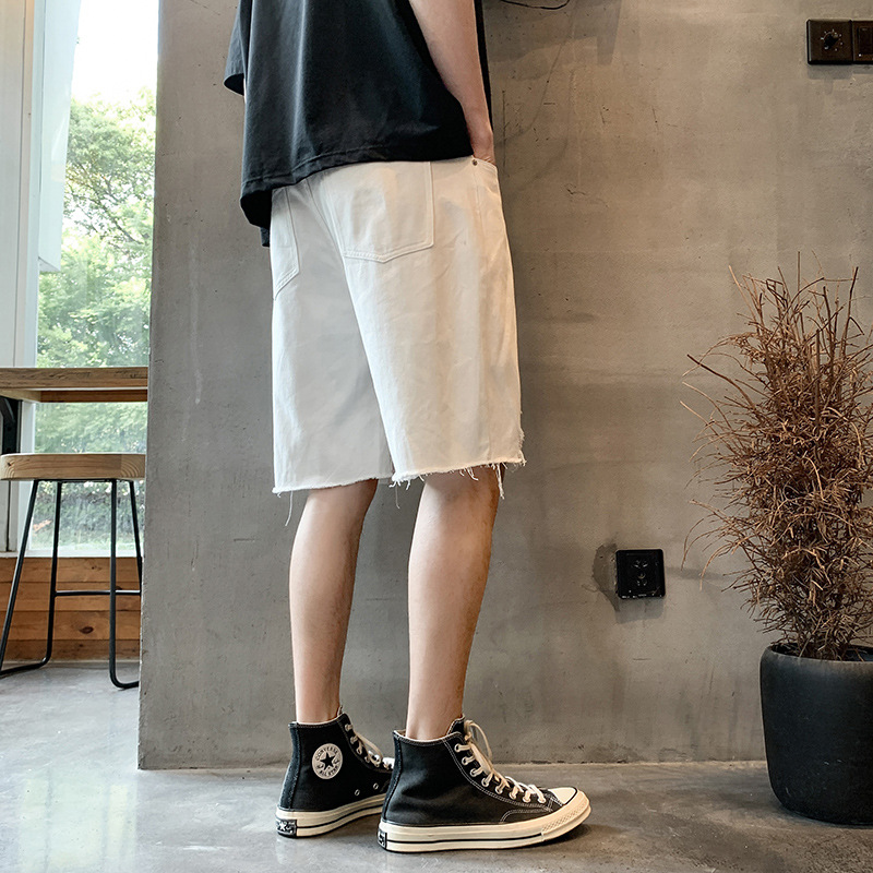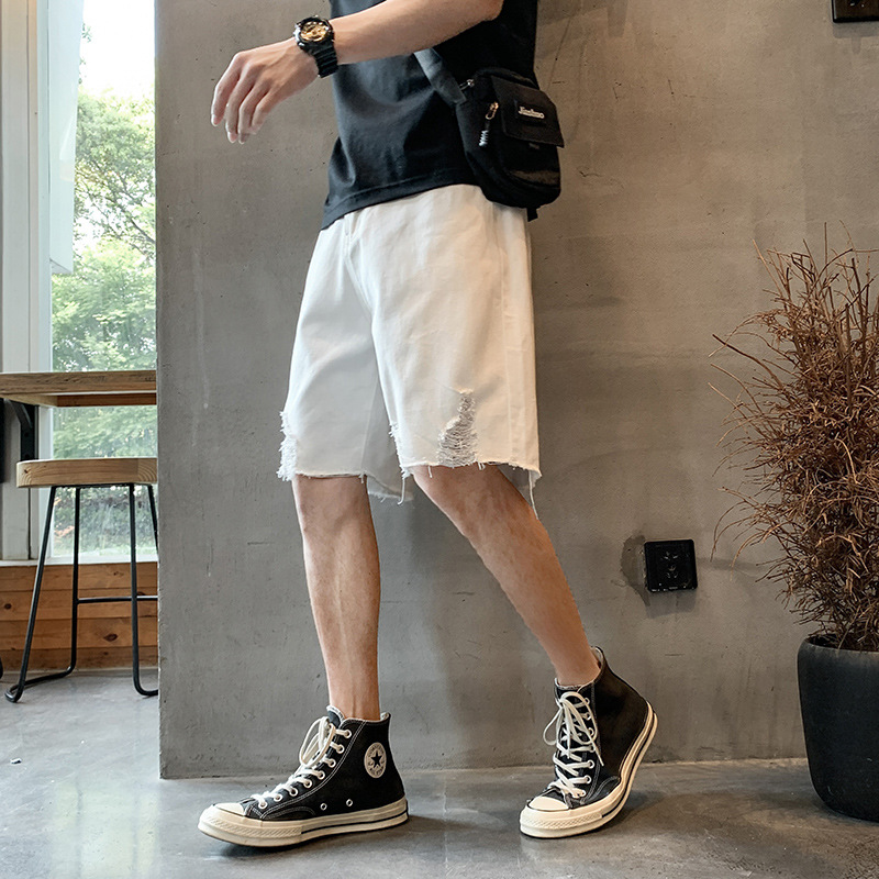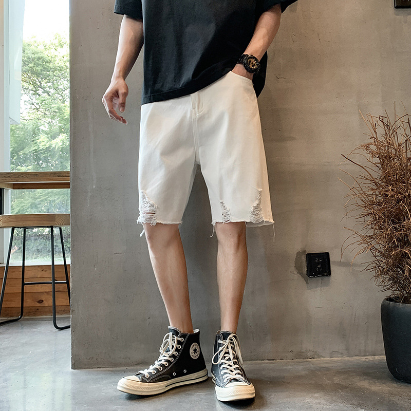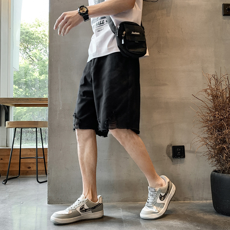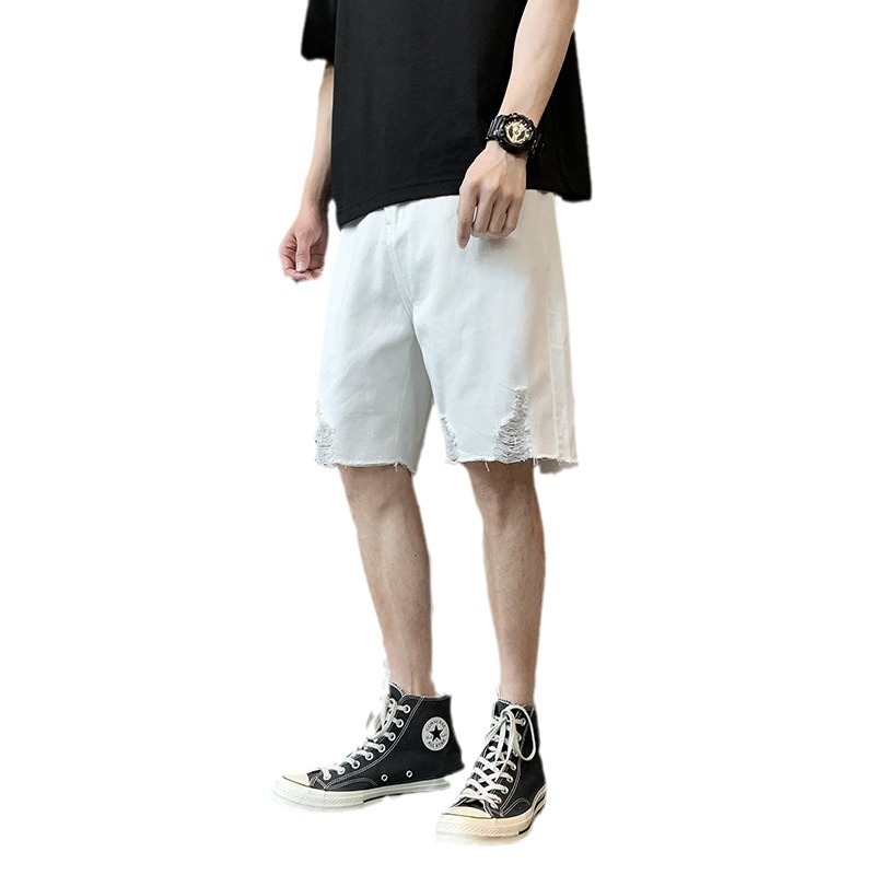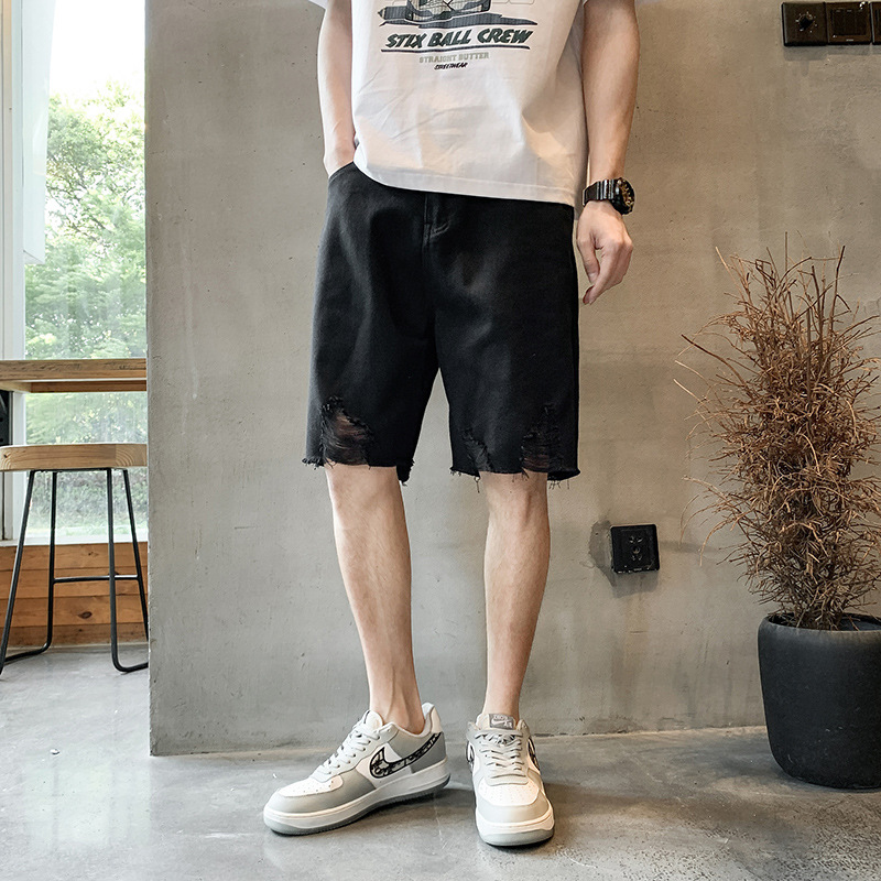 破洞五分牛仔裤男士宽松直筒青少年夏季薄款中裤潮流休闲运动短裤