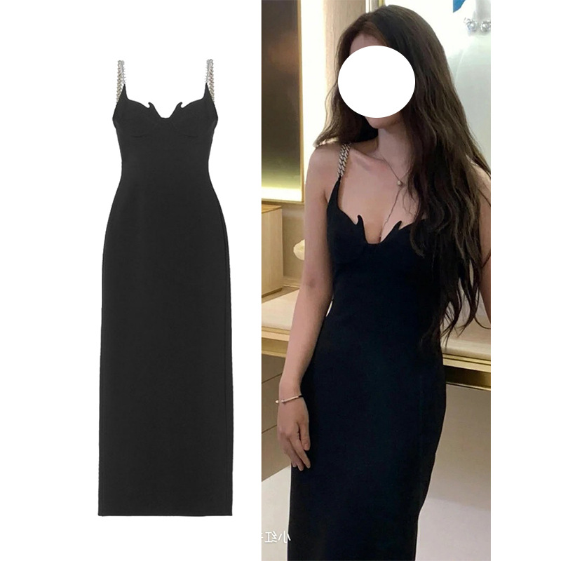 虞书欣同款黑色吊带连衣裙纯欲性感打底裙设计感气质露背礼服长裙