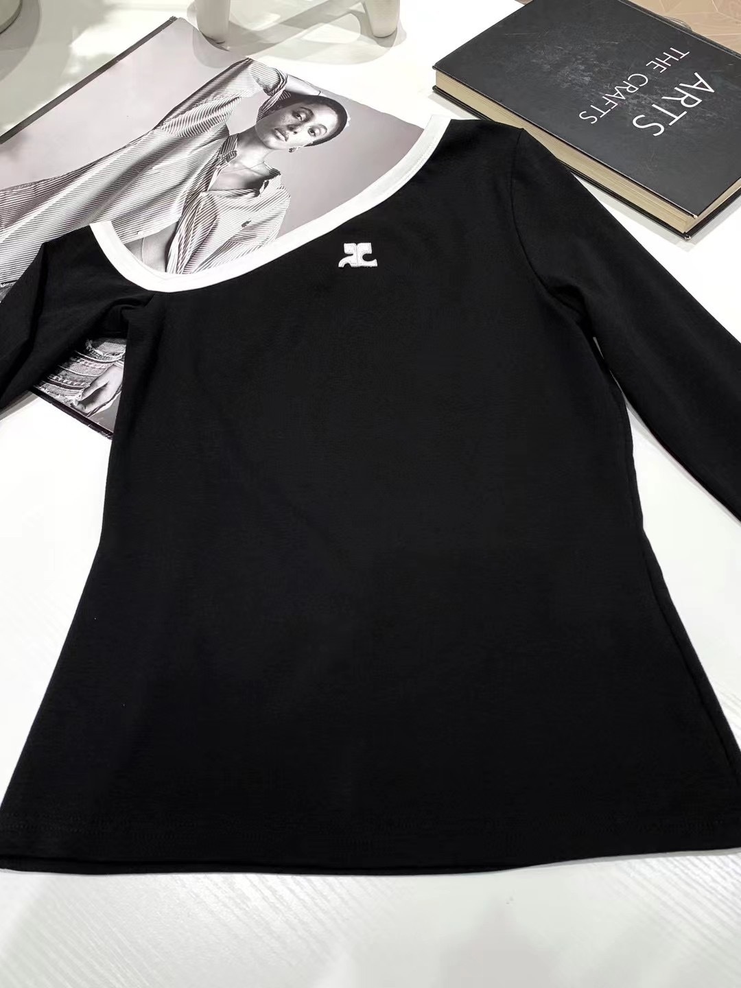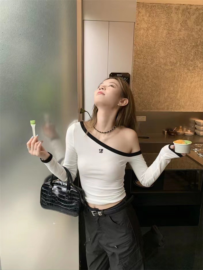 Melbourne| 秋季性感修身显瘦不对称露肩刺绣长袖T恤上衣女