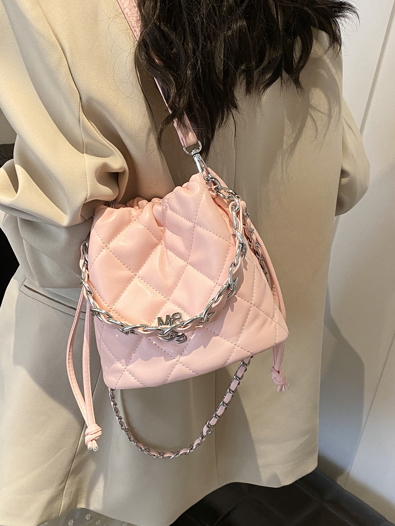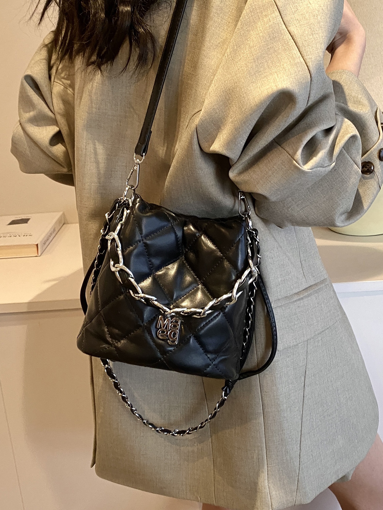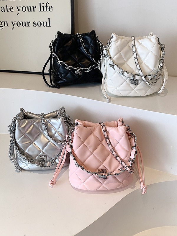 韩版小众质感水桶包女新款精致纯色单肩斜挎包菱格链条小拎包