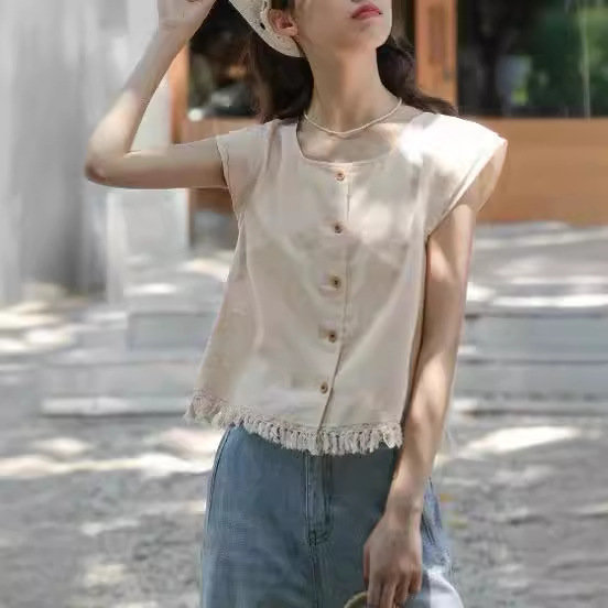 流苏下摆 小飞袖衬衫上衣女无袖吊带小衫