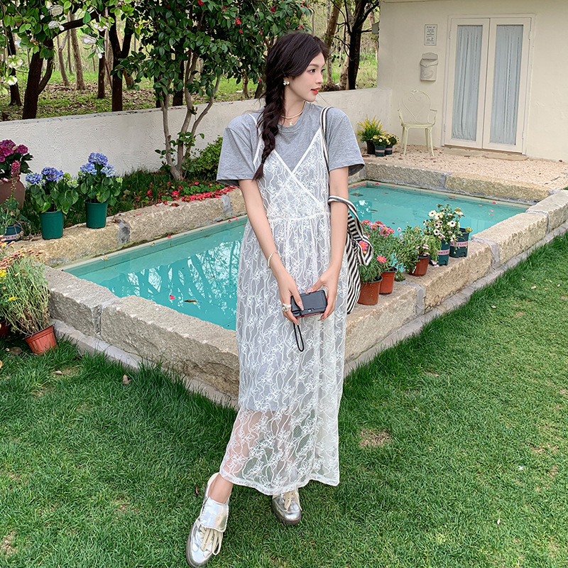 两件套蕾丝吊带连衣裙套装新款白色气质减龄镂空设计感连衣裙女