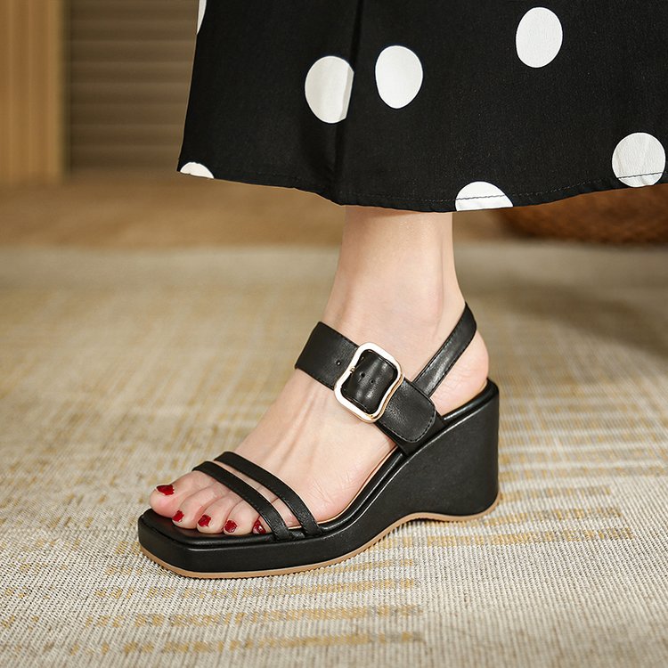 时装通勤坡跟凉鞋女夏季新款松糕厚底晚晚风中跟一字带女鞋子