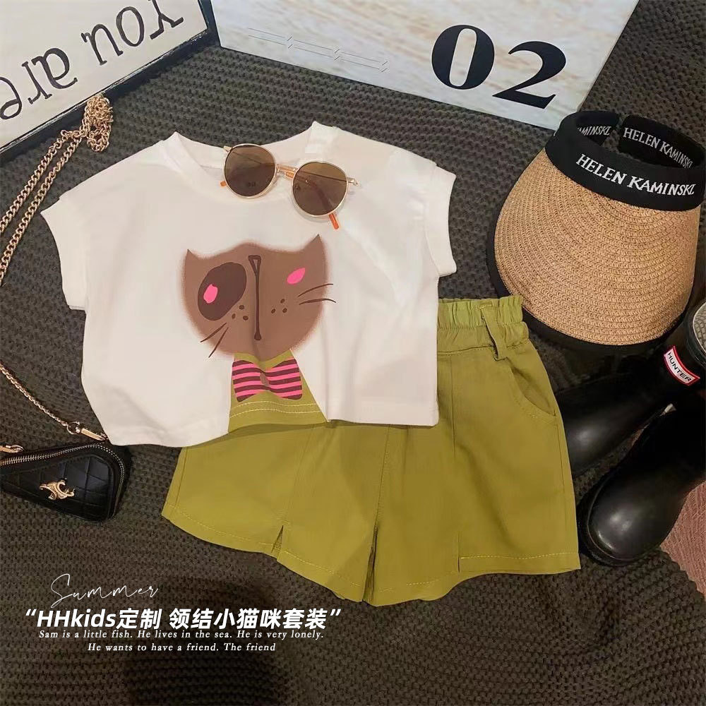 新品女童套装猫咪印花蝙蝠衫压褶短裤两件套2025夏装宽松纯棉休闲