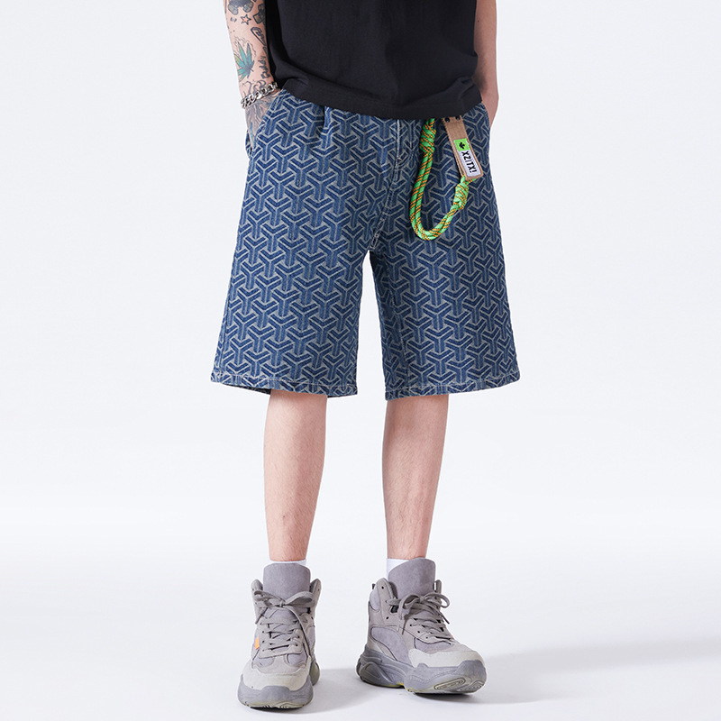 夏款 美式高街 休闲潮牌 提花牛仔短裤 男宽松大码五分裤蓝色
