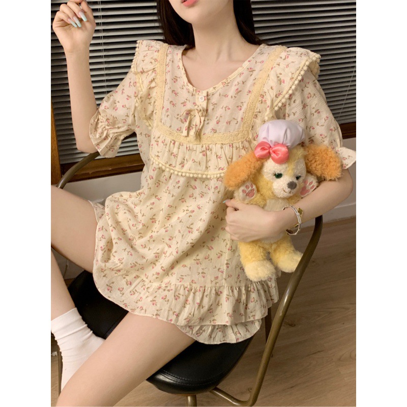 韩版甜美舒适提花全棉公主风少女可爱夏季短袖套装睡衣家居服