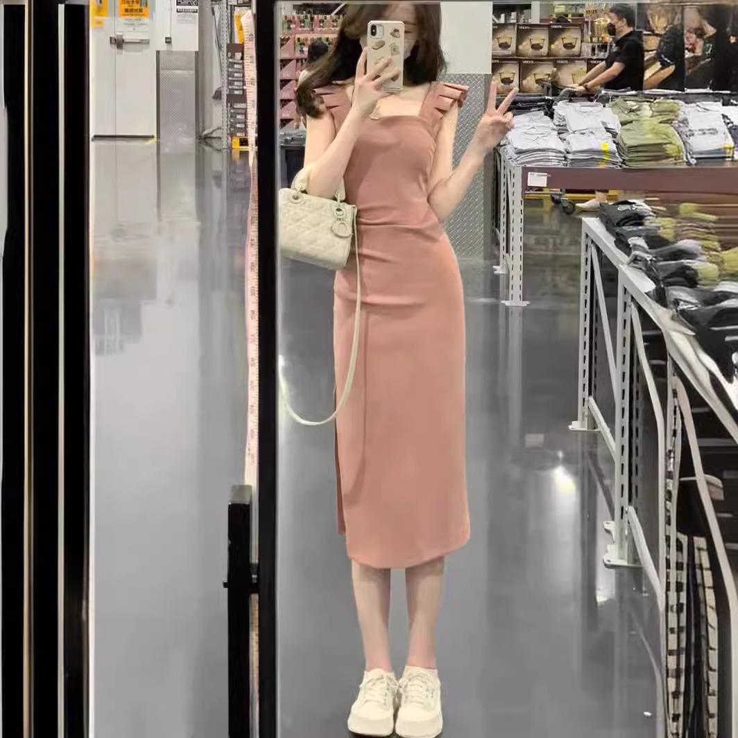 法式小飞袖连衣裙子女夏季设计感小众气质收腰显瘦修身侧开叉长裙