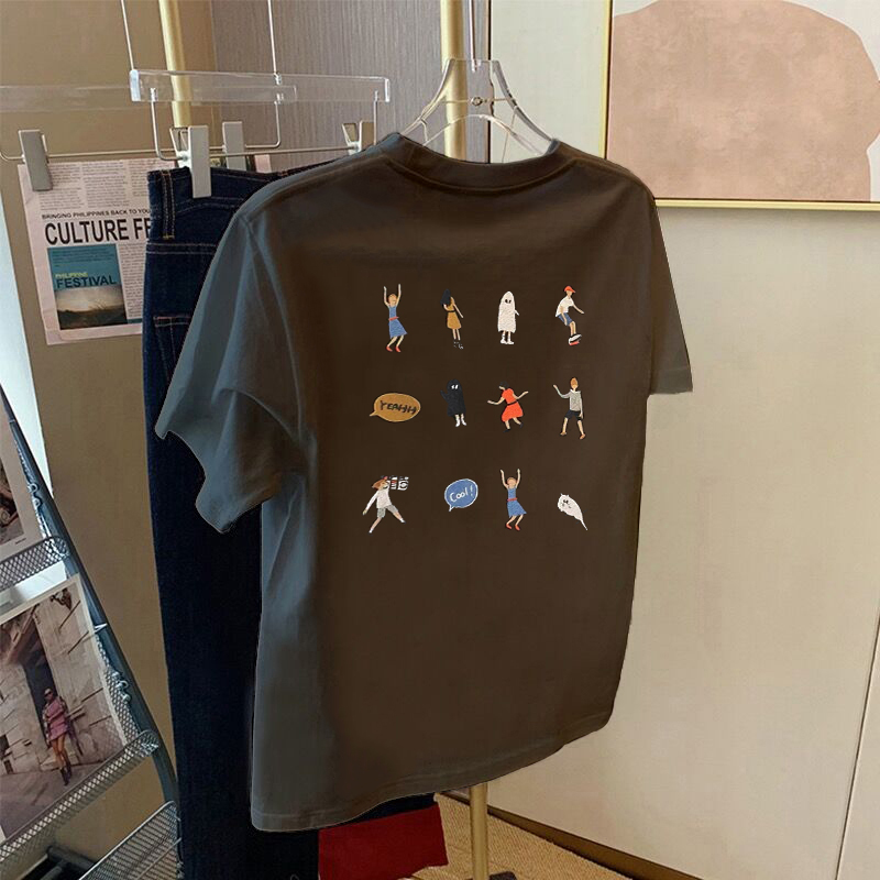 2025夏季新款灰色纯棉短袖t恤女宽松百搭休闲卡通印花小个子上衣