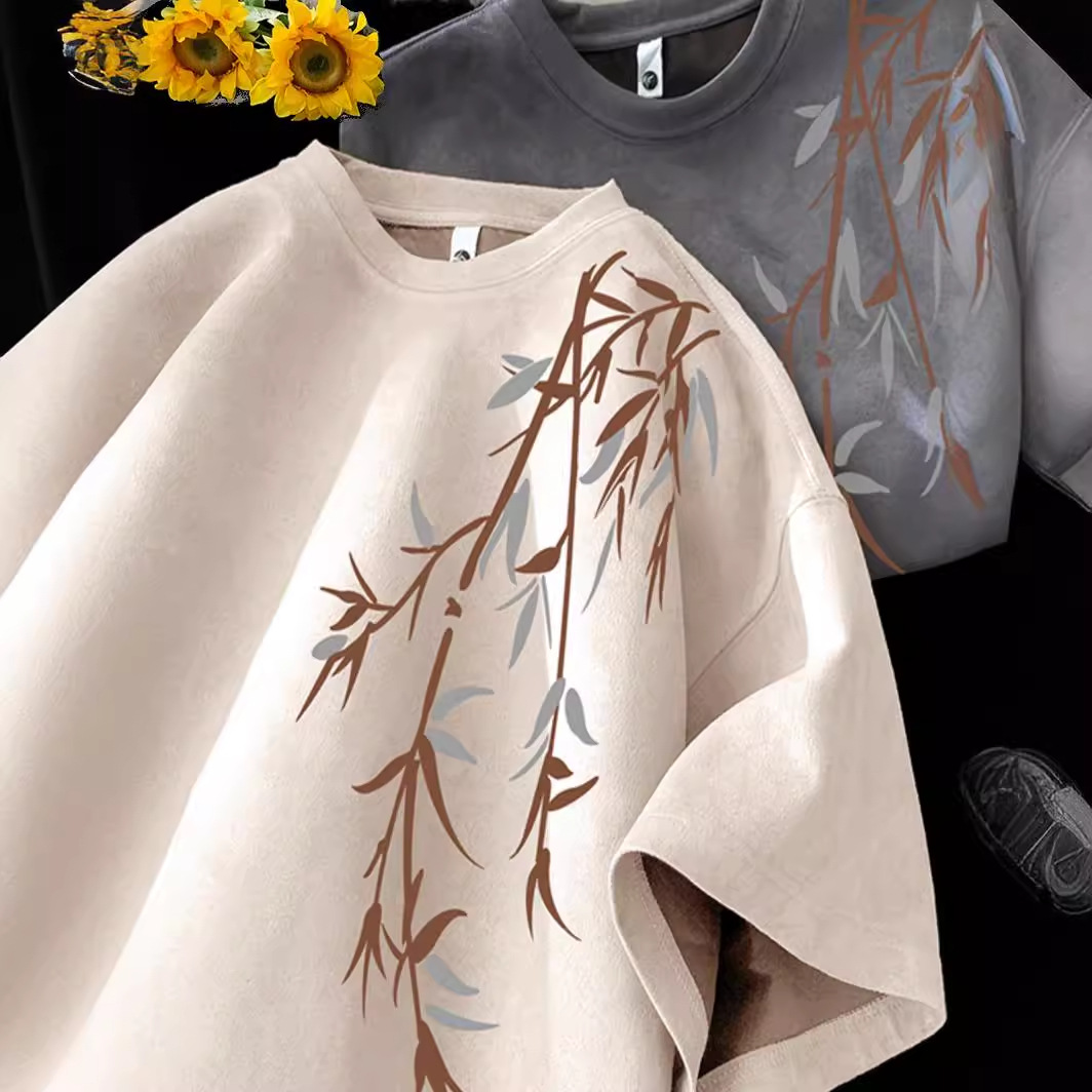 麂皮短袖t恤男夏季新款杏色新中式男装国潮竹子印花中国风