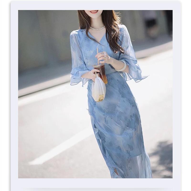 |夏天的风|荷叶边蓝色仙女裙新款小清新雪纺连衣裙