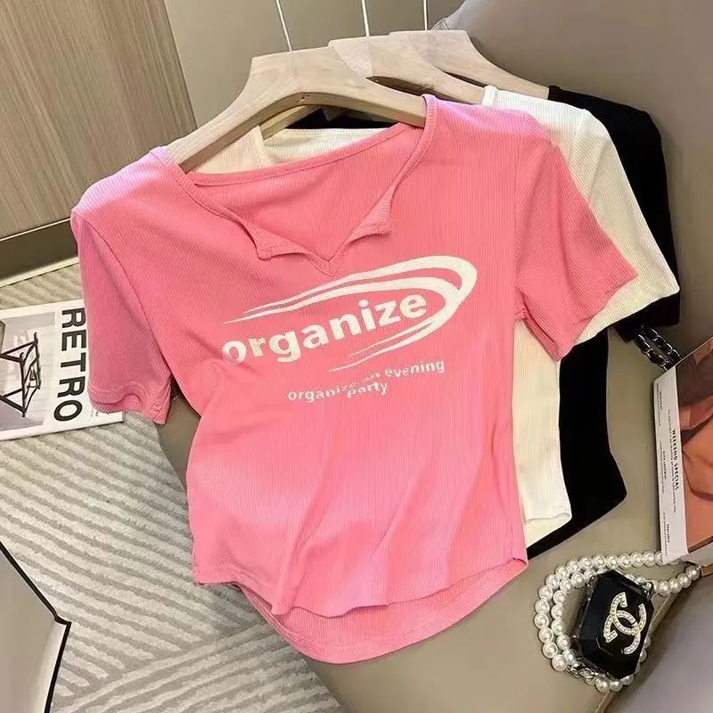v领设计感小众短袖T恤女夏季新款辣妹体恤修身显瘦短款上衣潮