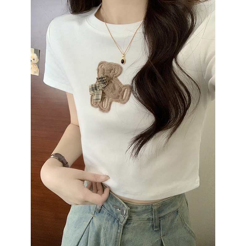 复古小熊白色正肩t恤女短袖春夏新款辣妹修身设计感短款半袖上衣