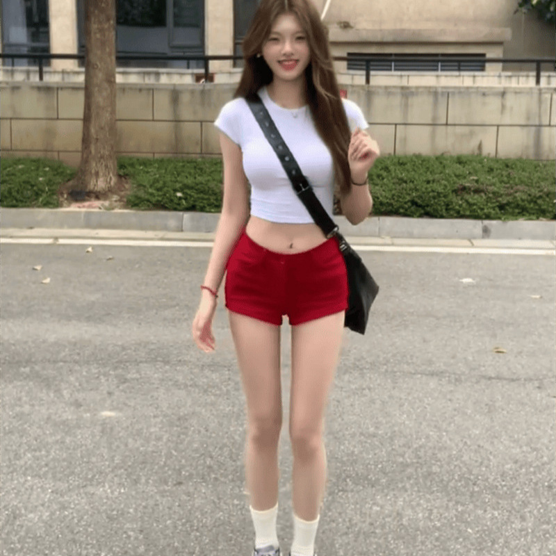 红色辣妹牛仔短裤女夏季新款美式复古高腰直筒显瘦外穿包臀热裤子