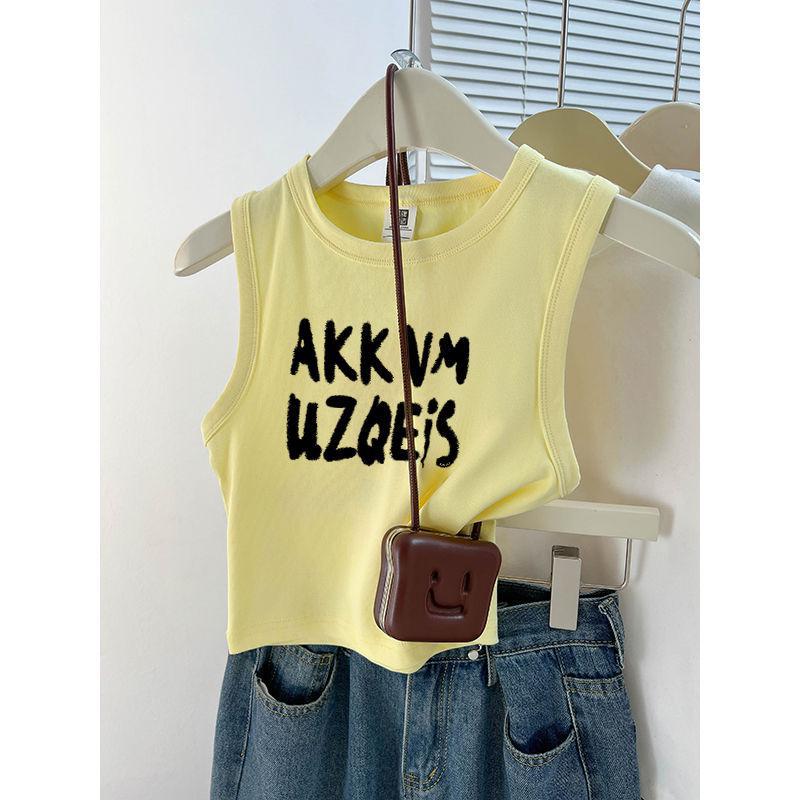 嫩黄色辣妹掐腰工字无袖吊带背心女夏季新款美式复古短款外穿上衣