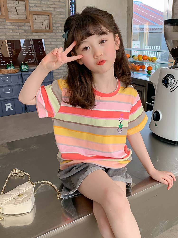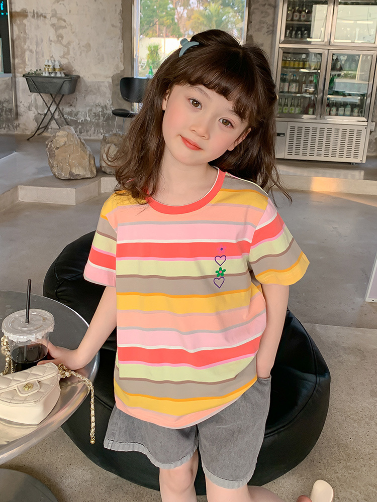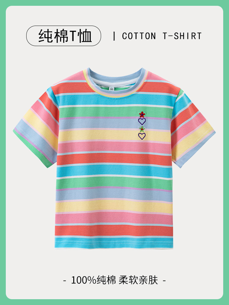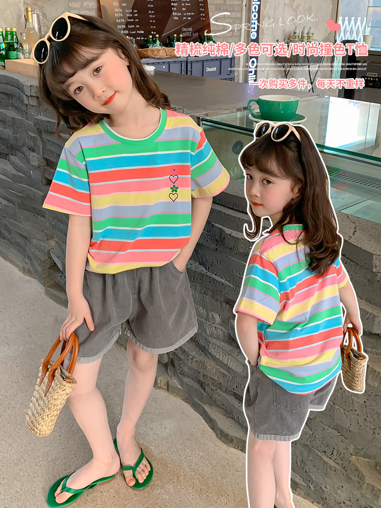 条纹100纯棉女童短袖t恤全棉中大童年新款夏季童装儿童上衣