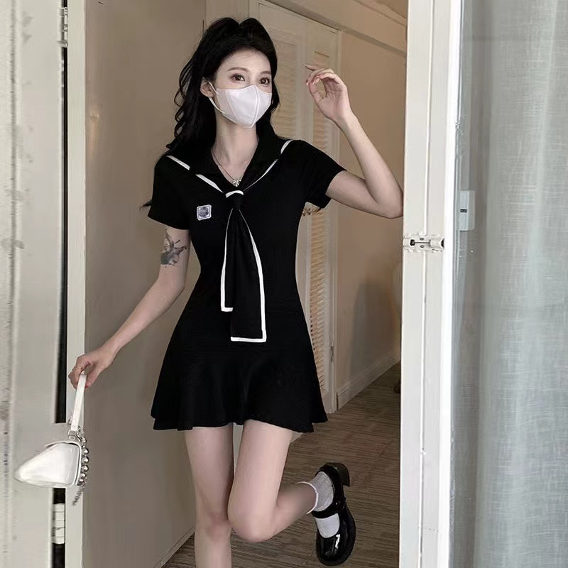 夏季学院风海军领披肩领带连衣裙女纯欲甜辣妹荷叶边少女裙子