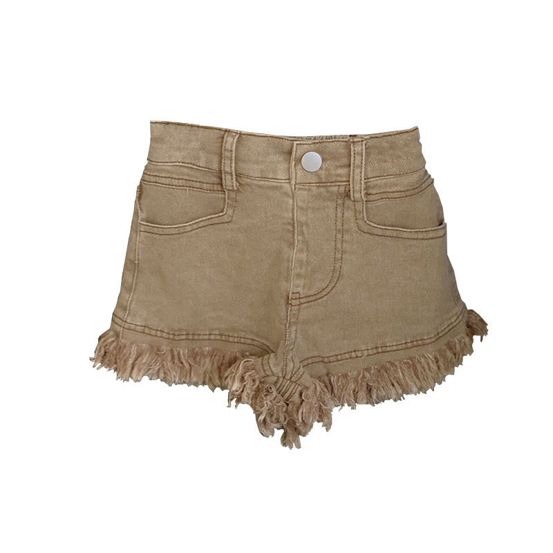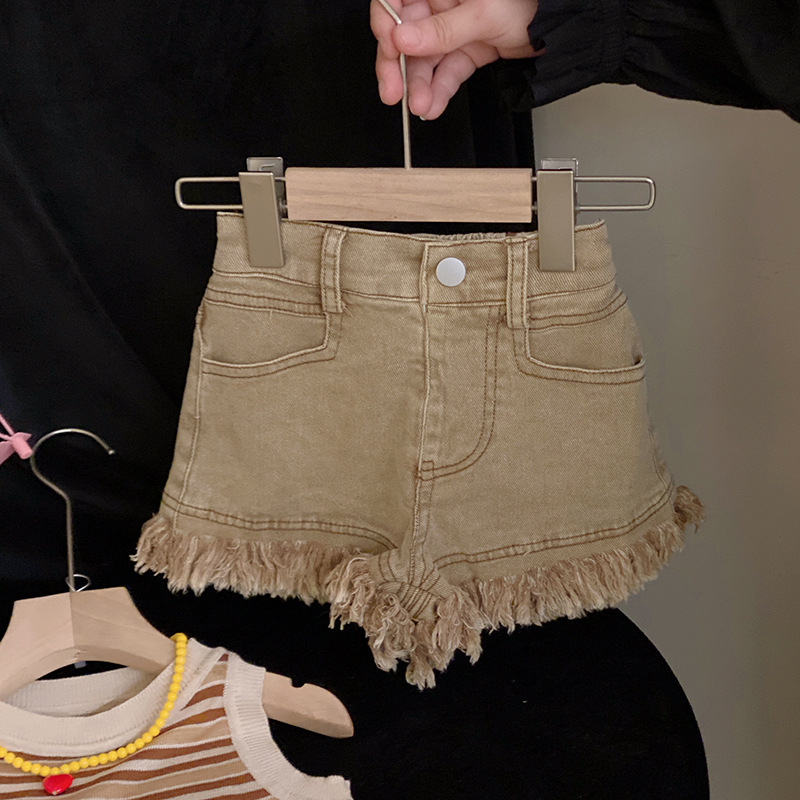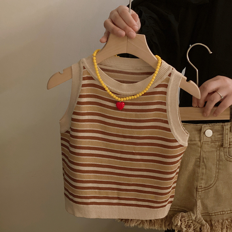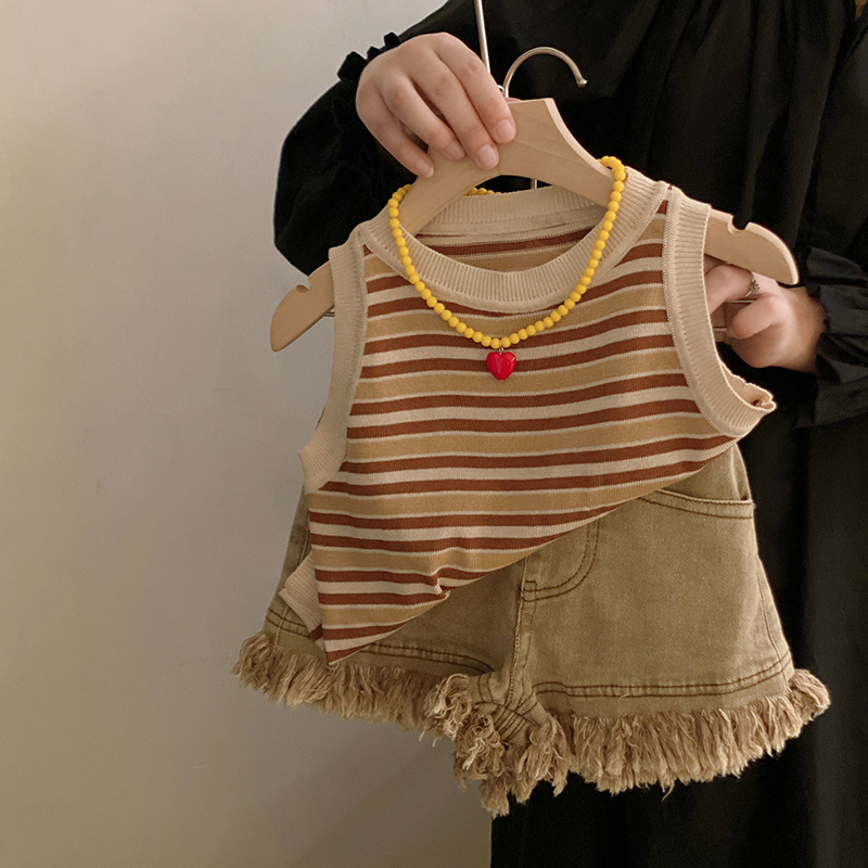 韩版童装夏季新款女童洋气条纹针织背心毛边牛仔短裤套装潮