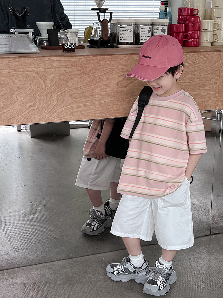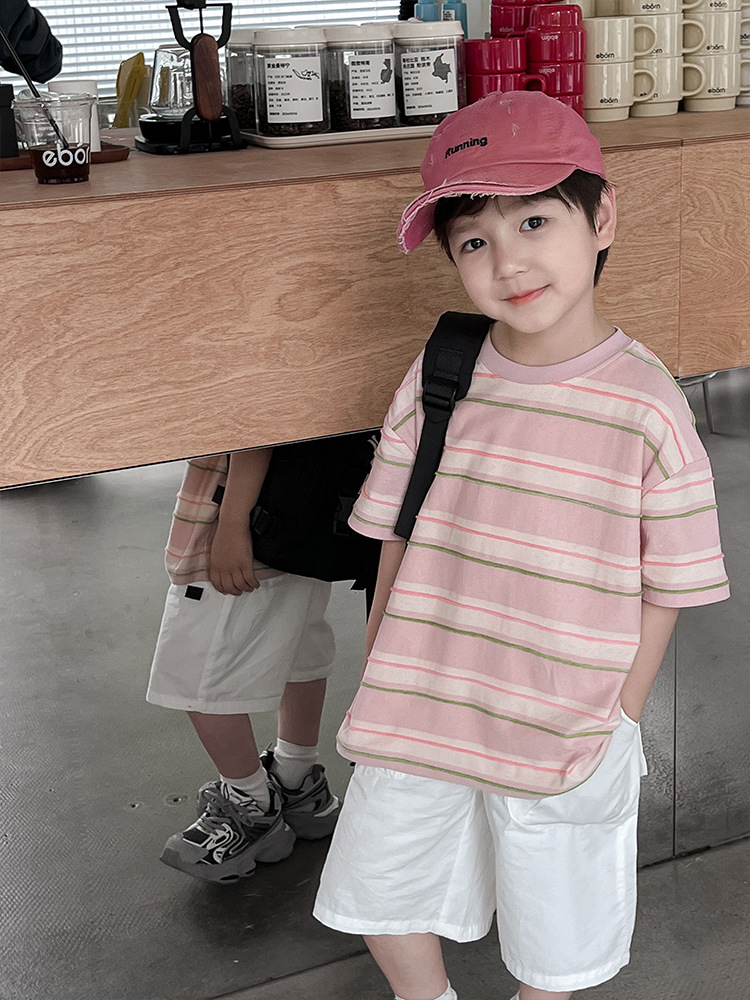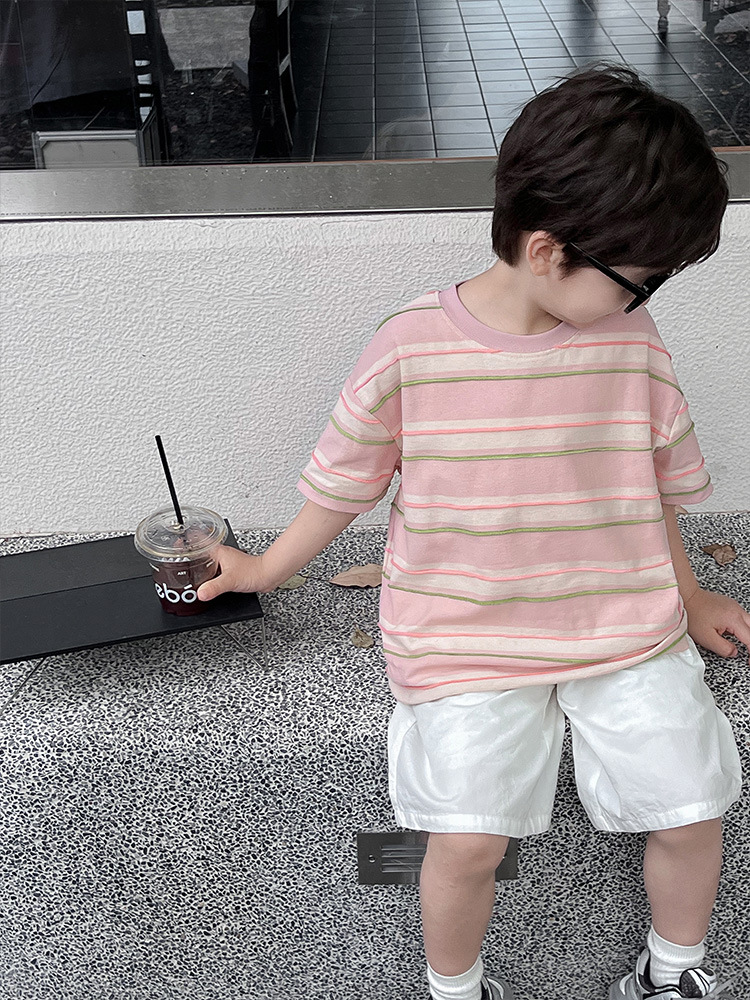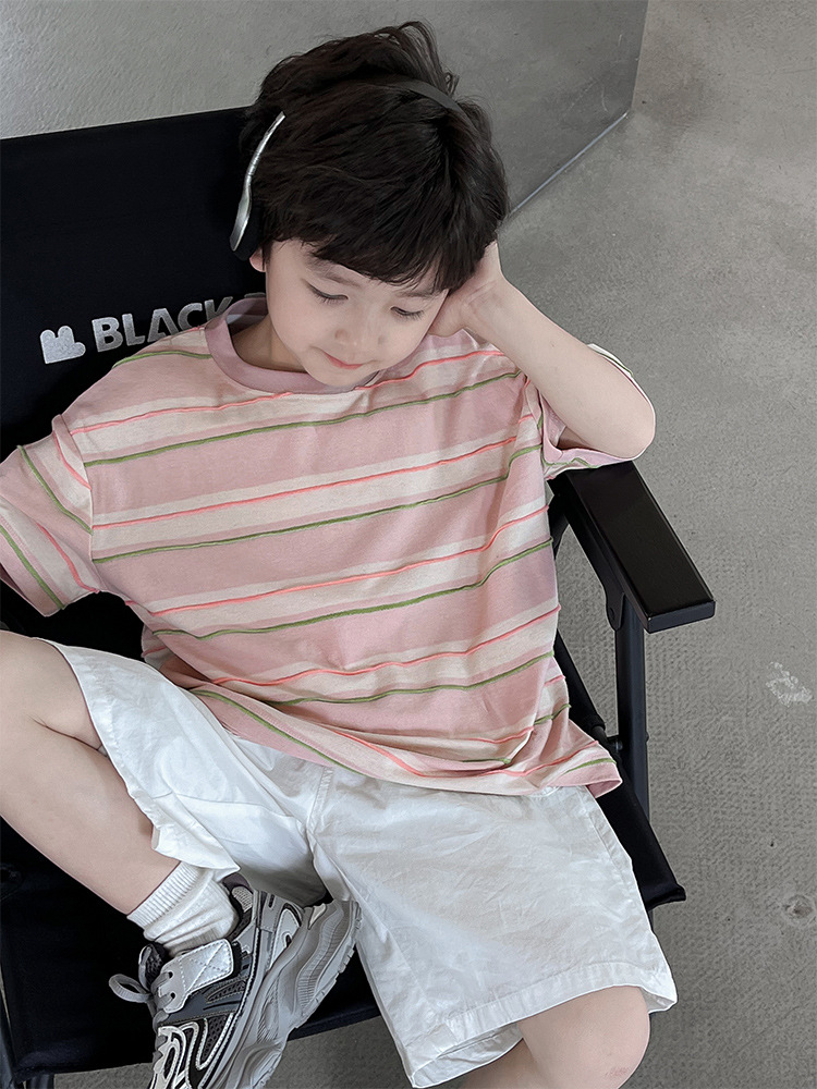 童酷儿童夏装新品湖州织里童装宝宝T恤可爱粉色条纹男童短袖