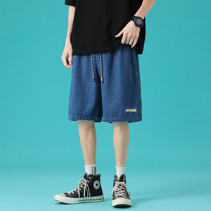 牛仔短裤男夏季薄款日式做旧潮牌时尚直筒复古宽松大码休闲五分裤