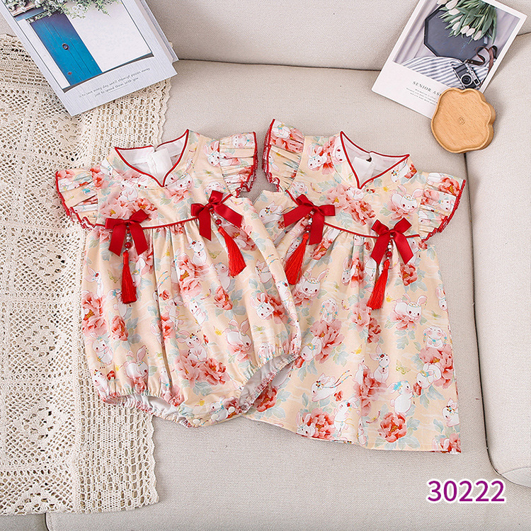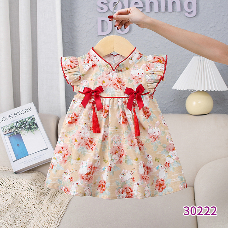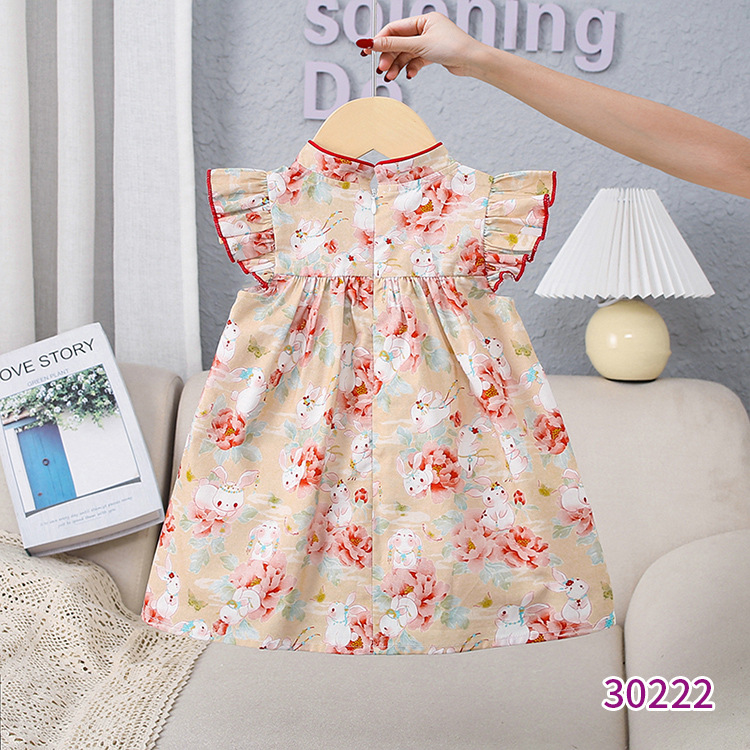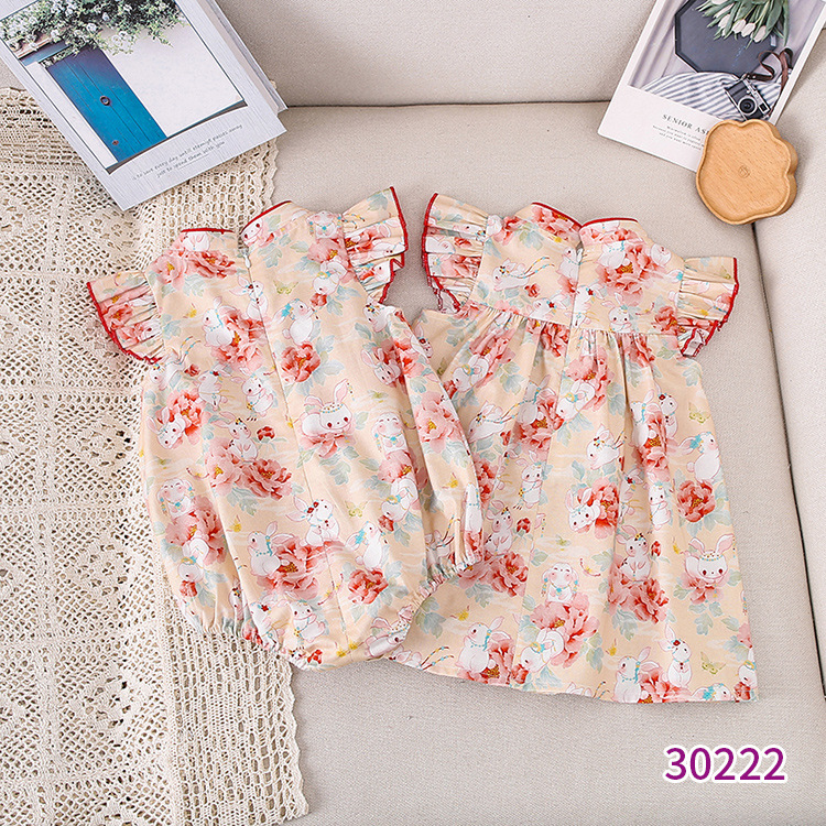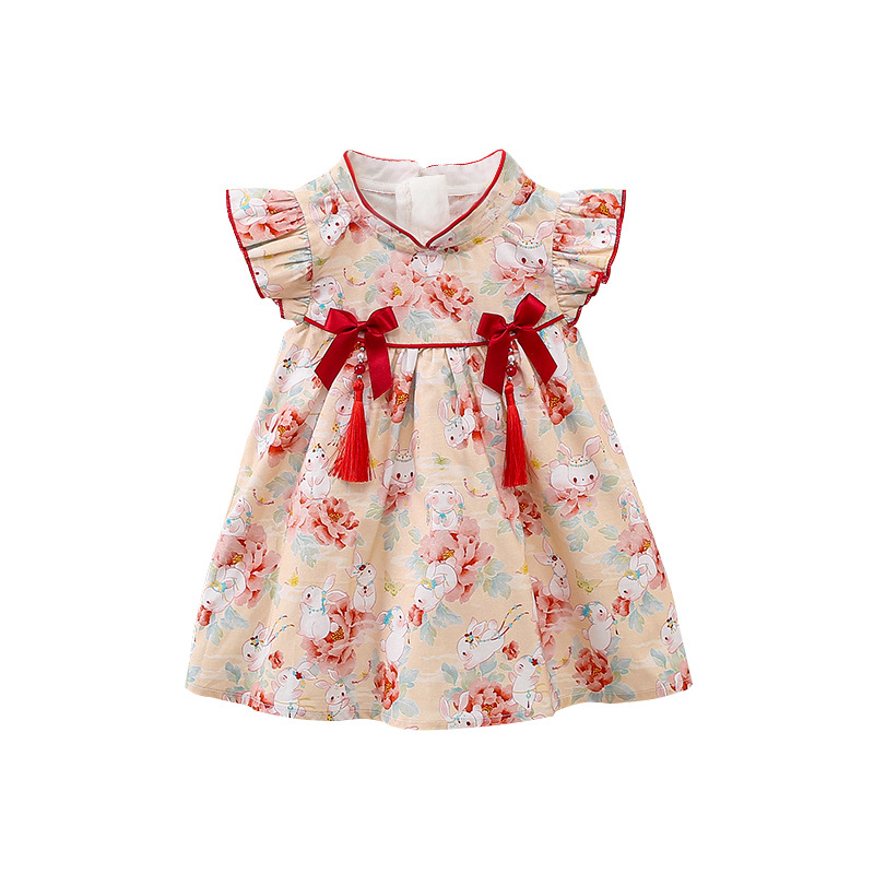 天静童装年夏季新款女童连衣裙 小兔子碎花儿童短袖裙子