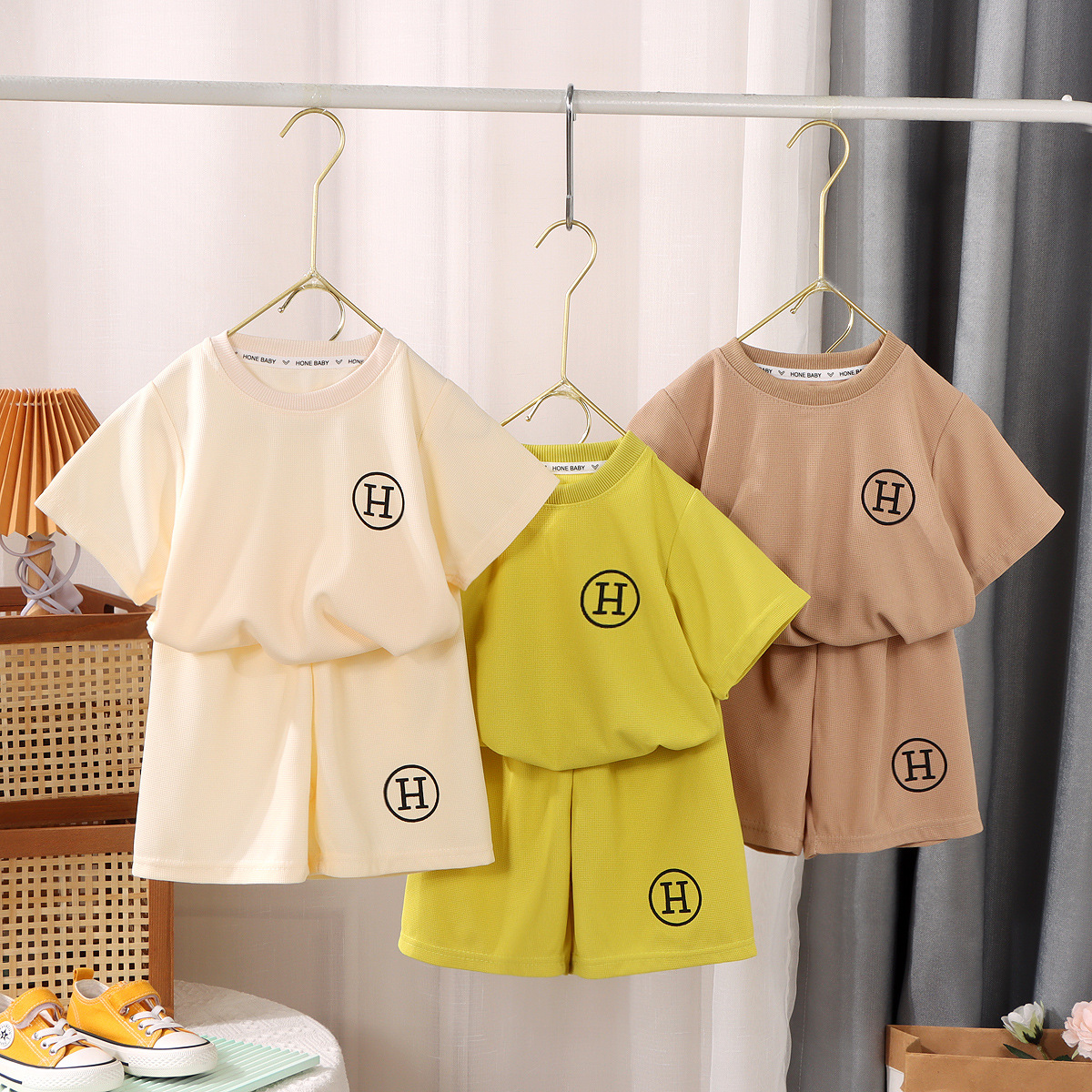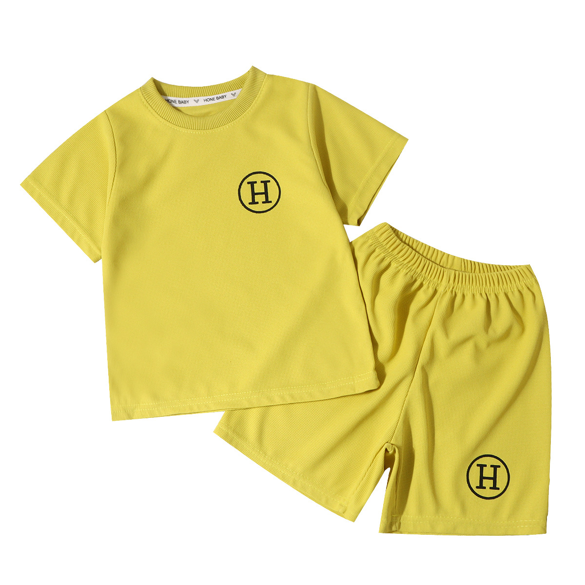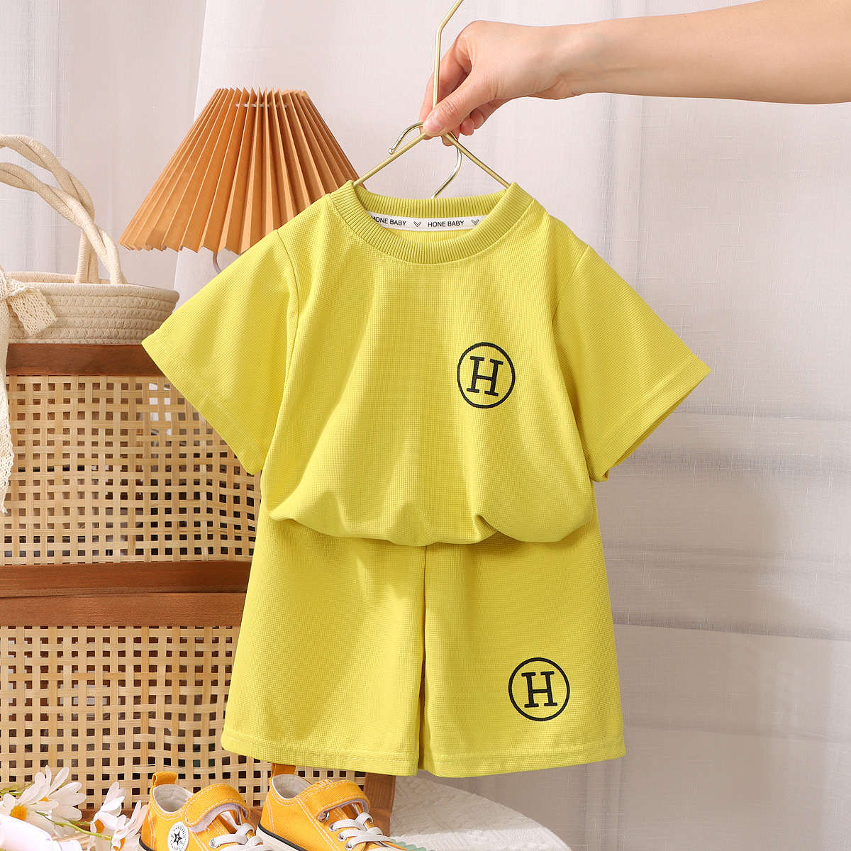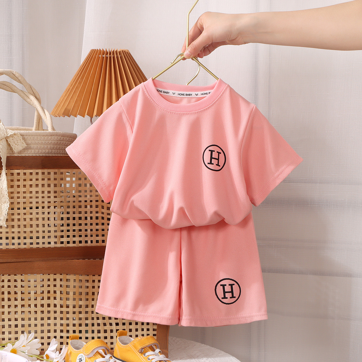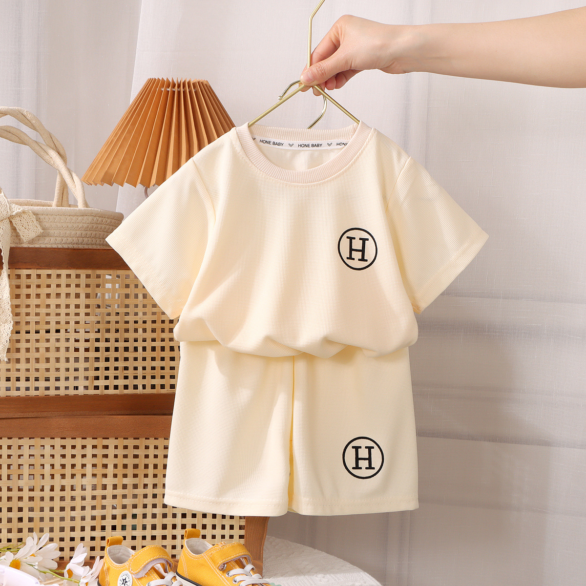 儿童男女夏季短袖套装新款华夫格中大童男孩童装休闲两件套