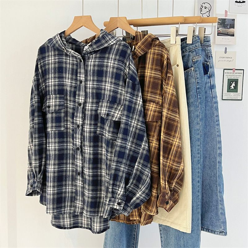 复古连帽格子长袖衬衫女春秋宽松慵懒显瘦中长款衬衣休闲外套