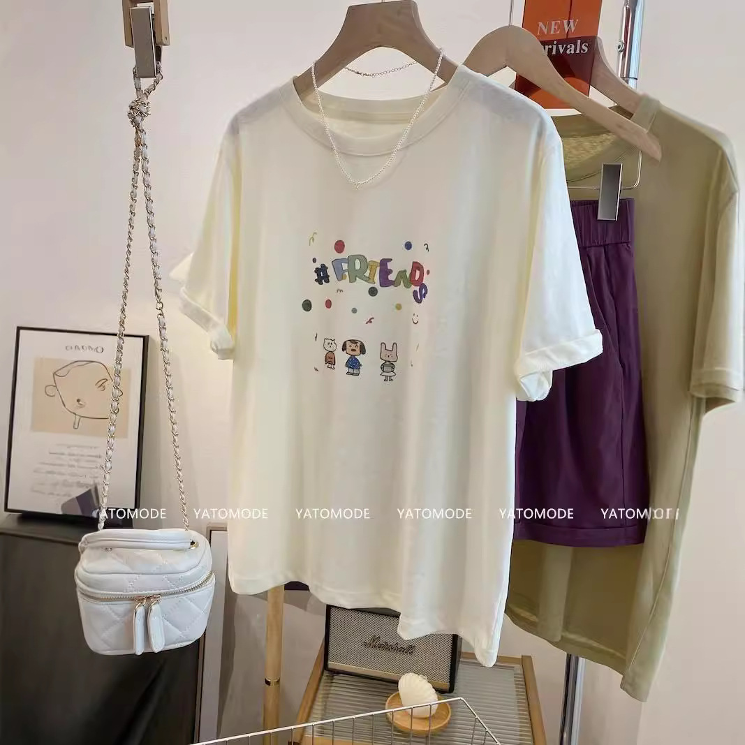超手感莫代尔彩色音符字母印花百搭休闲小众短袖T恤半截袖上衣女