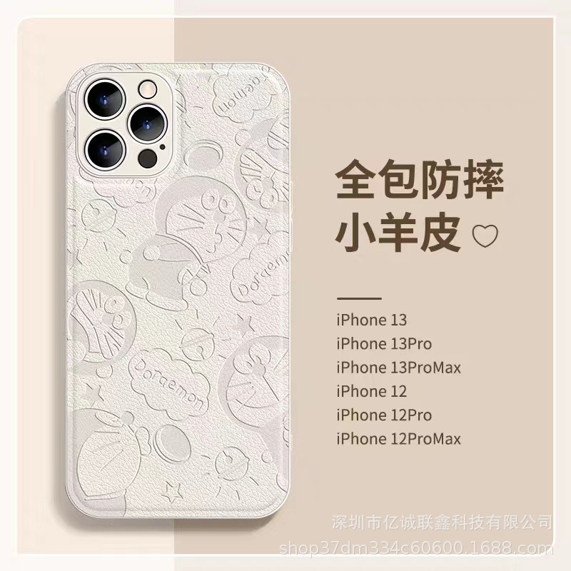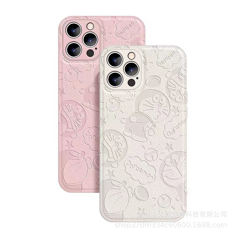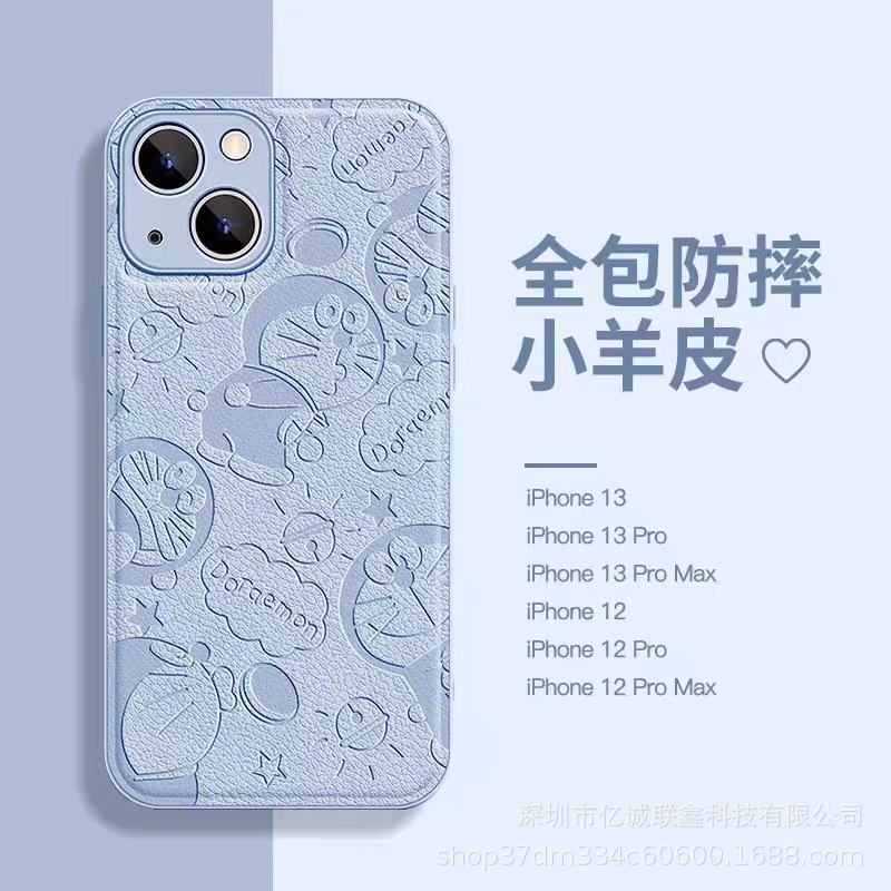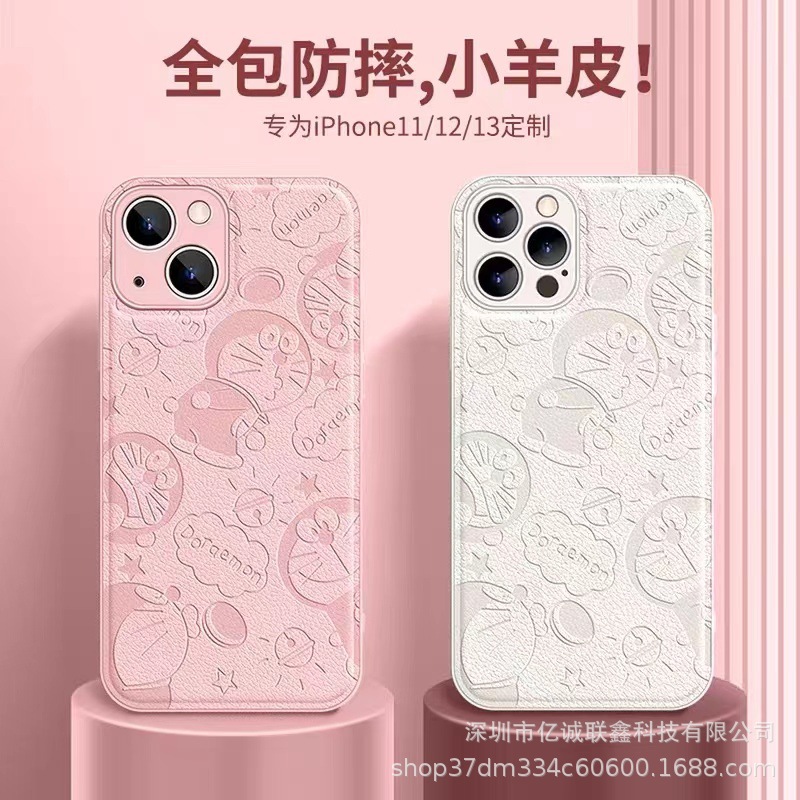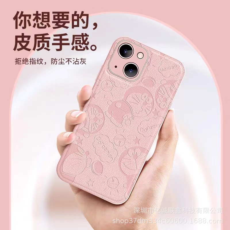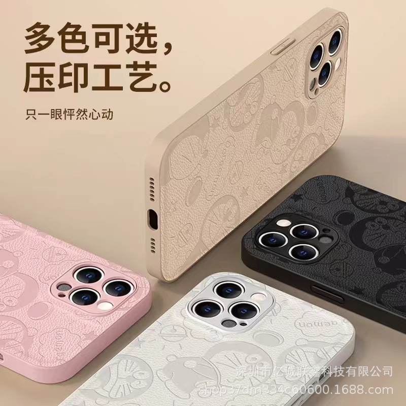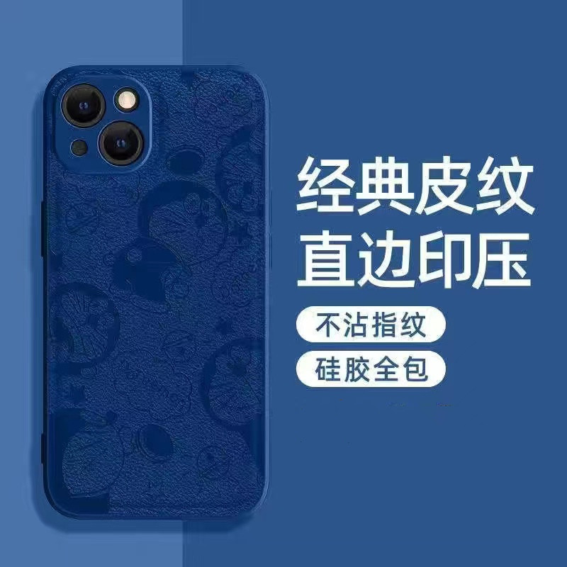 叮当猫适用苹果14手机壳iPhone15Promax全包镜头防摔11皮纹压印8p