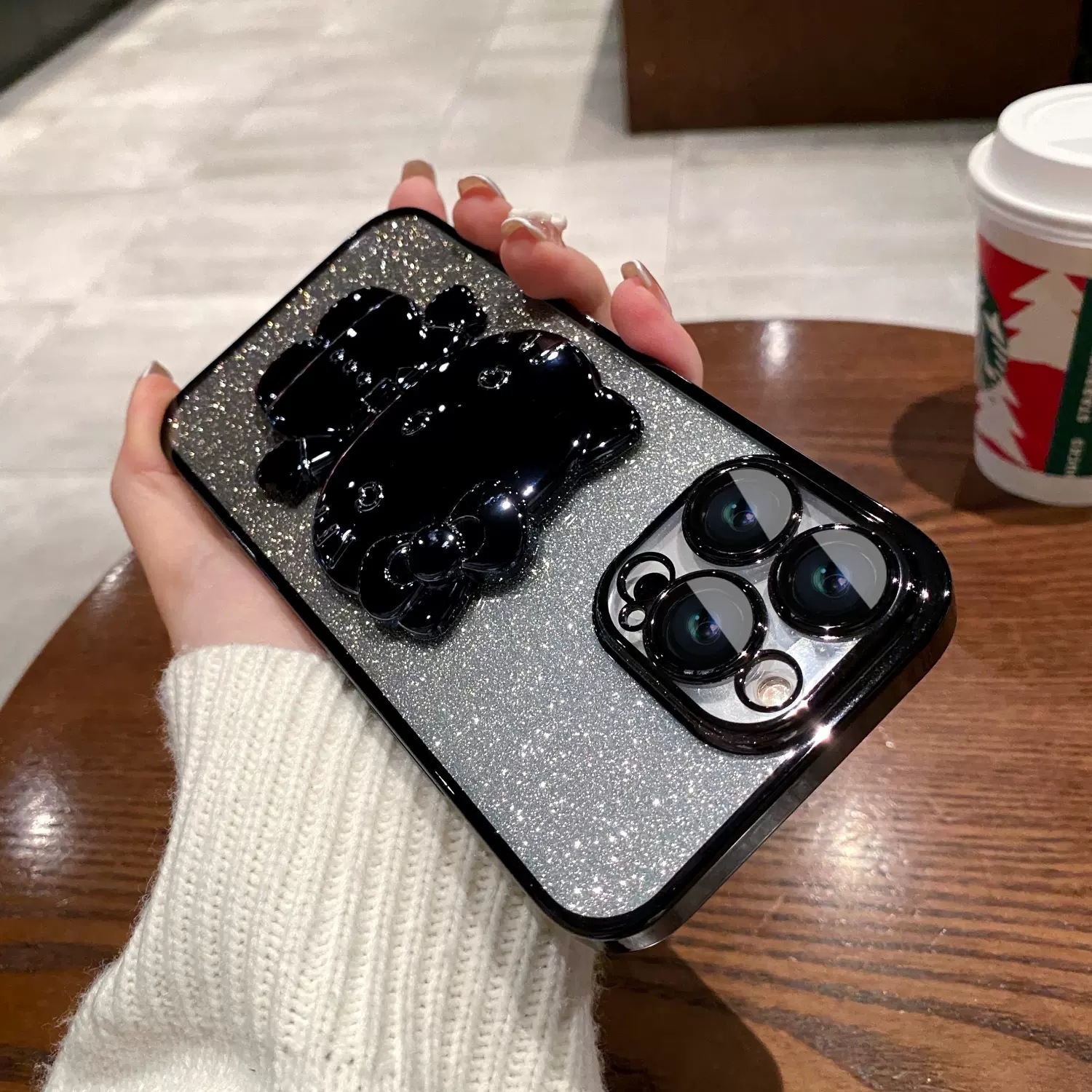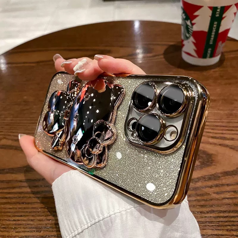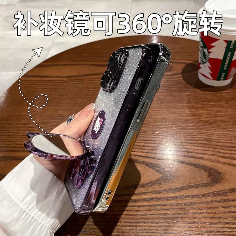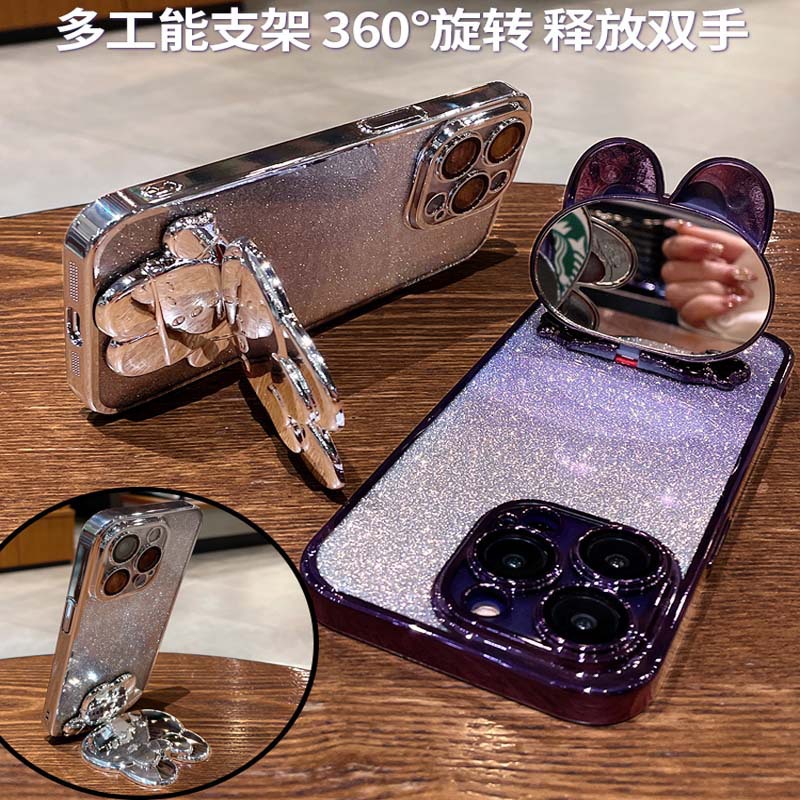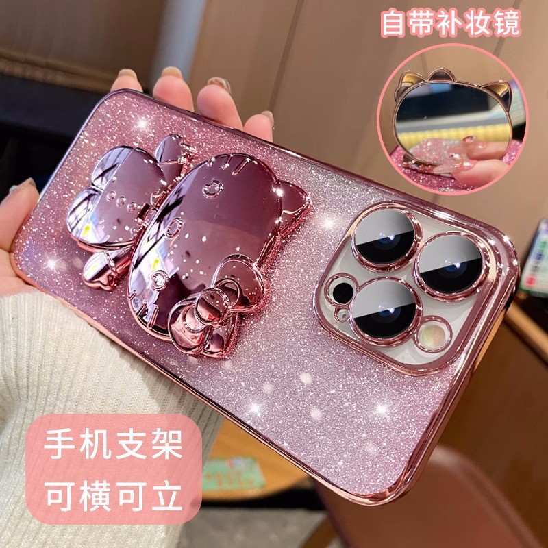 渐变闪粉适用苹果15promax手机壳猫咪补妆镜支架iPhone14电镀软壳