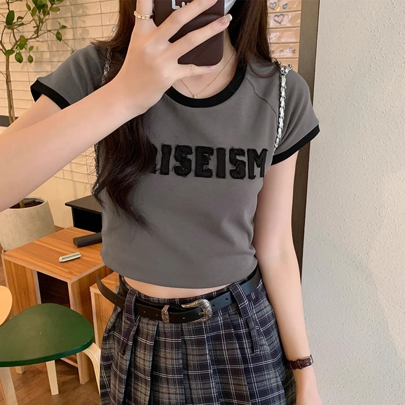 新款拼色圆领正肩t恤女短袖春夏高腰辣妹纯欲修身显瘦短上衣