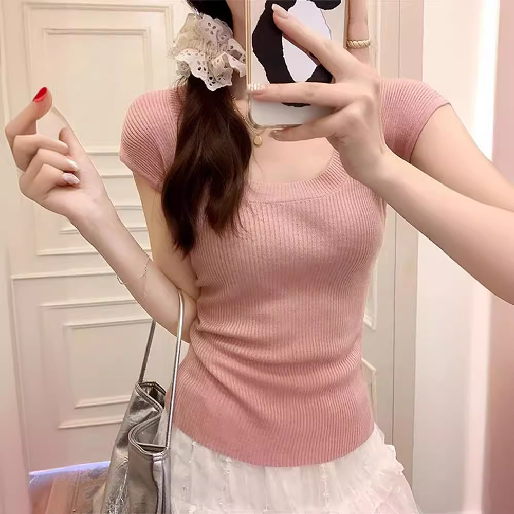 新款收腰显瘦短袖t恤上衣女夏小众设计感辣妹短款修身针织衫