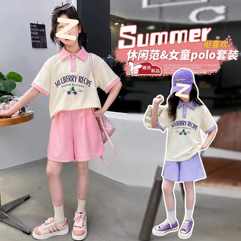 女童夏装POLO衫套装2025新款中大童洋气拼色翻领上衣五分裤两件套