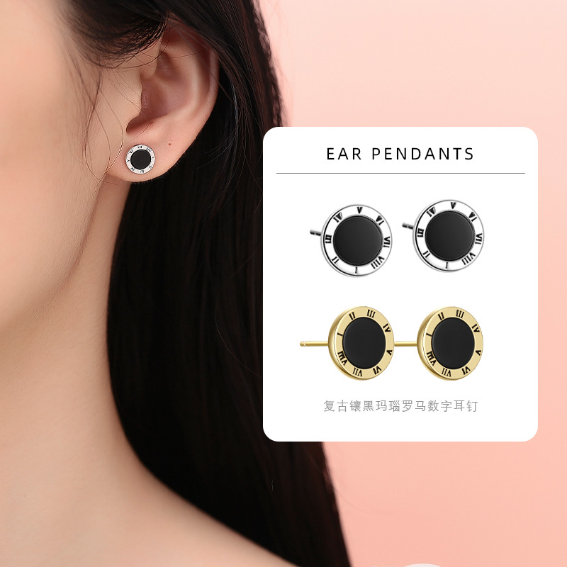 S925纯银复古镶黑玛瑙罗马数字耳钉小众养耳洞夏季免摘耳骨钉耳饰