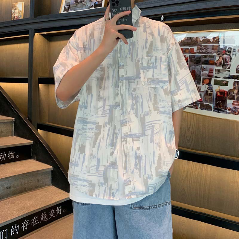 冰丝衬衫男设计感小众夏季ins港风情侣原宿五分半袖扎染衬衣