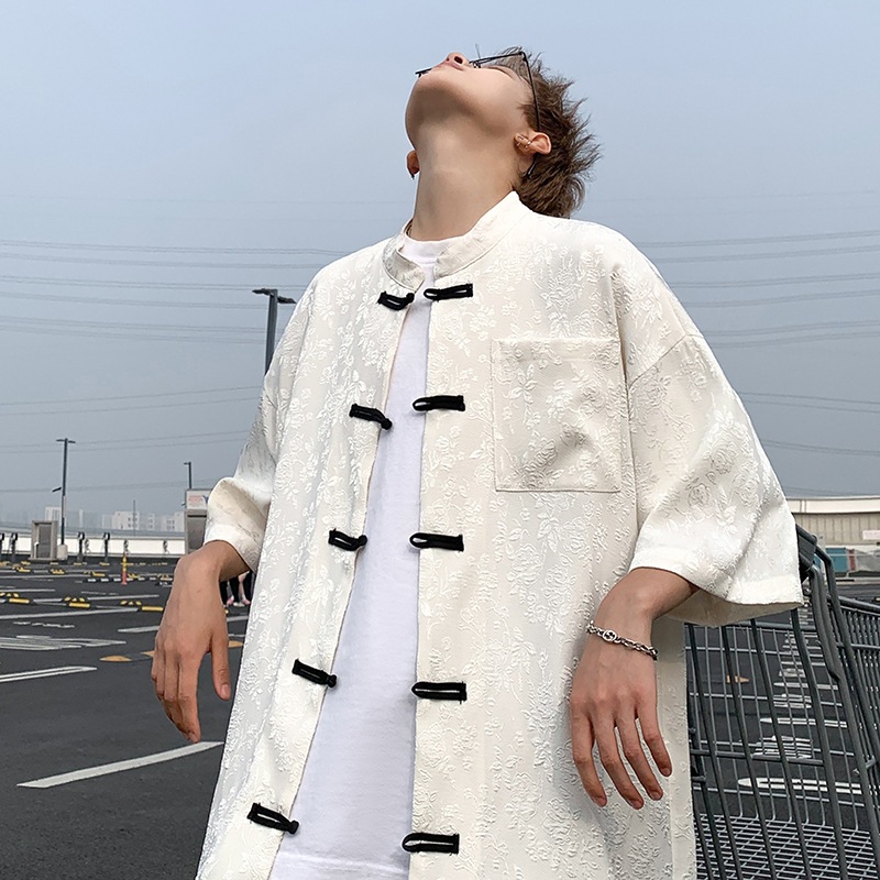 夏新款潮男新中式碎花7泡泡盘扣短袖五分袖衬衫