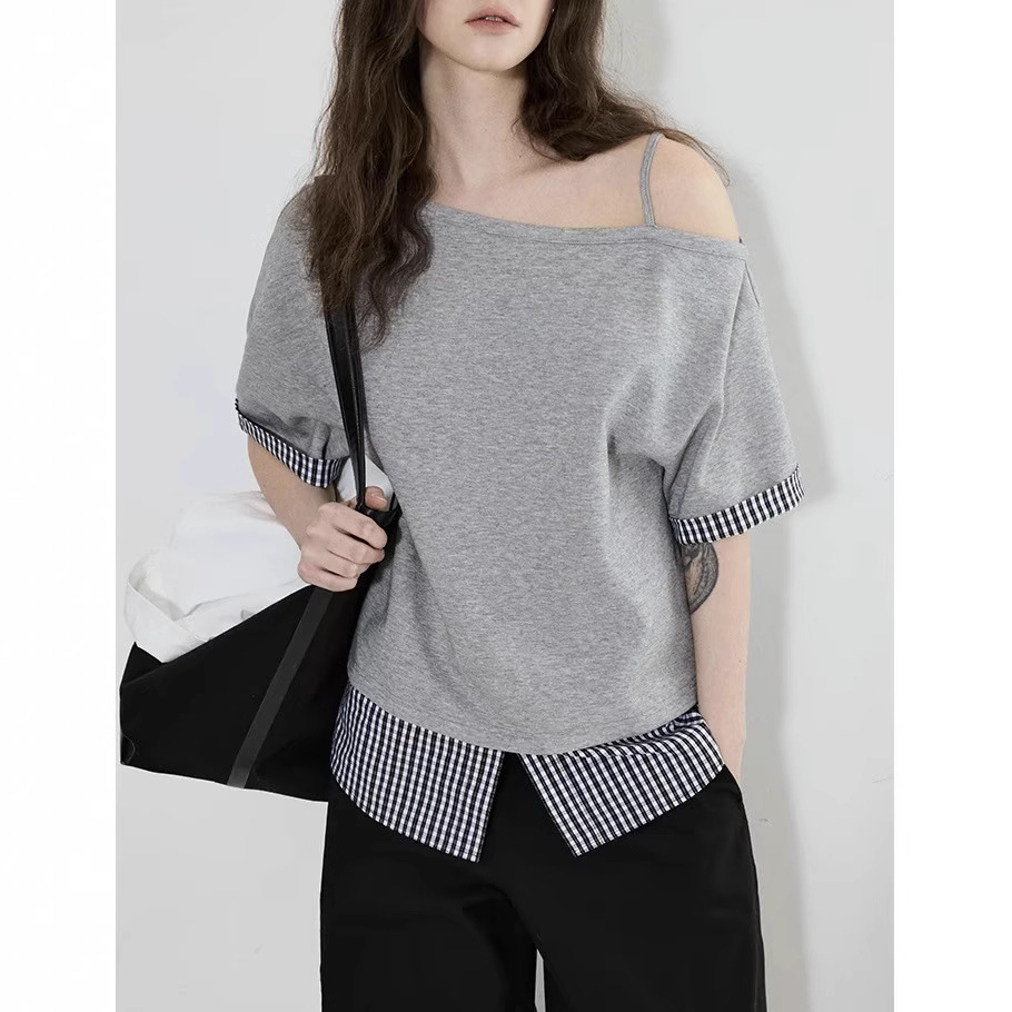 时髦感斜肩上衣女2025春夏miu系格纹拼接宽松假两件t恤