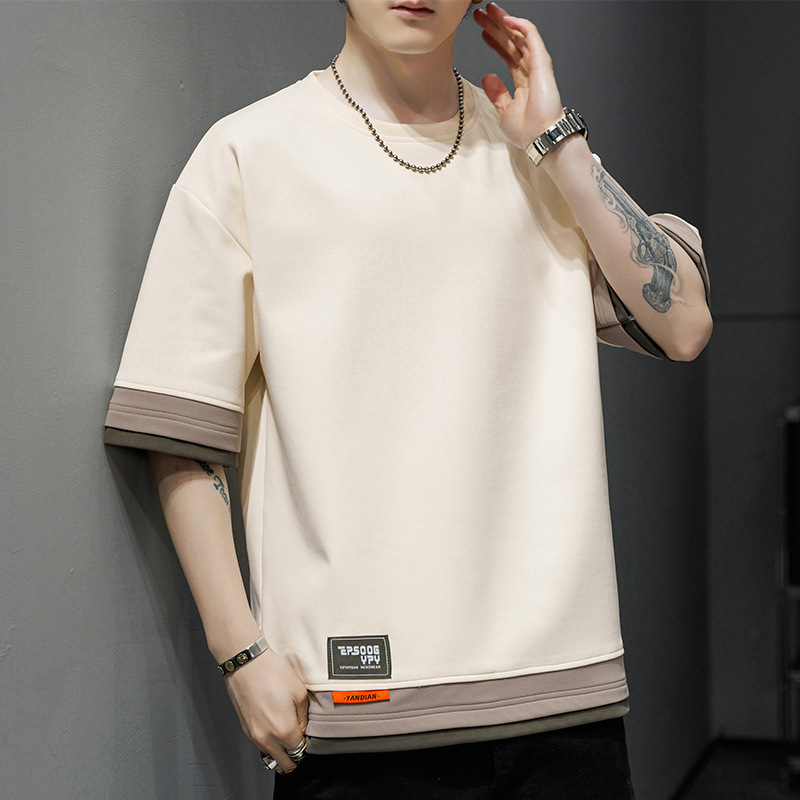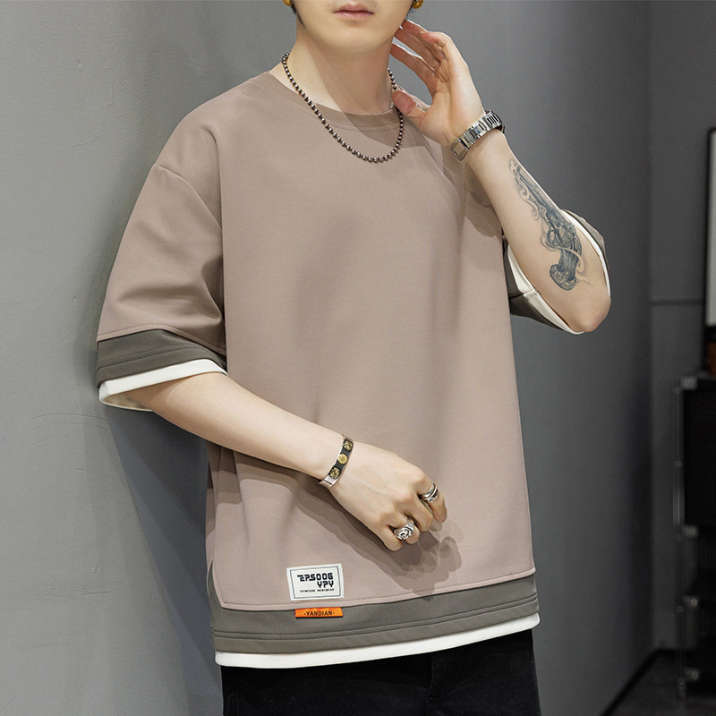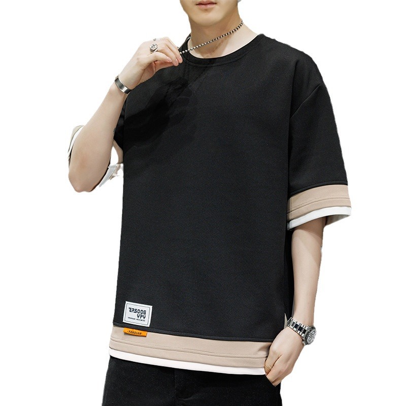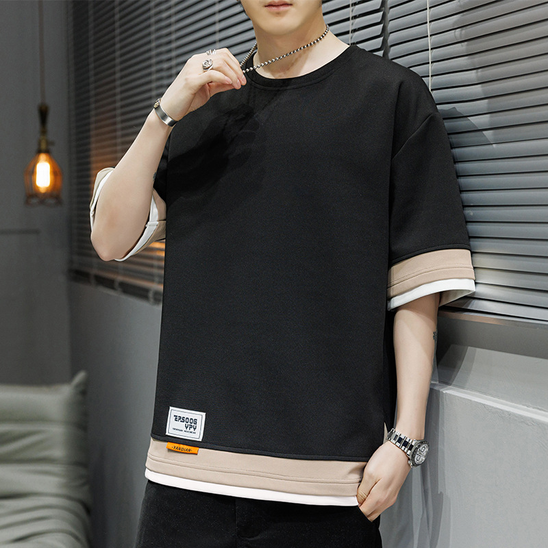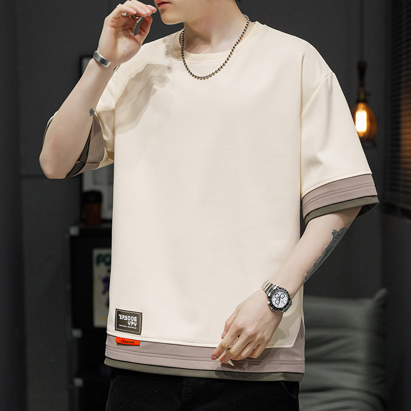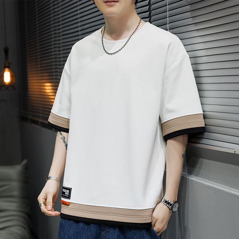 夏季短袖T恤男士潮牌假两件t恤男半袖宽松圆领休闲打底衫上衣潮流