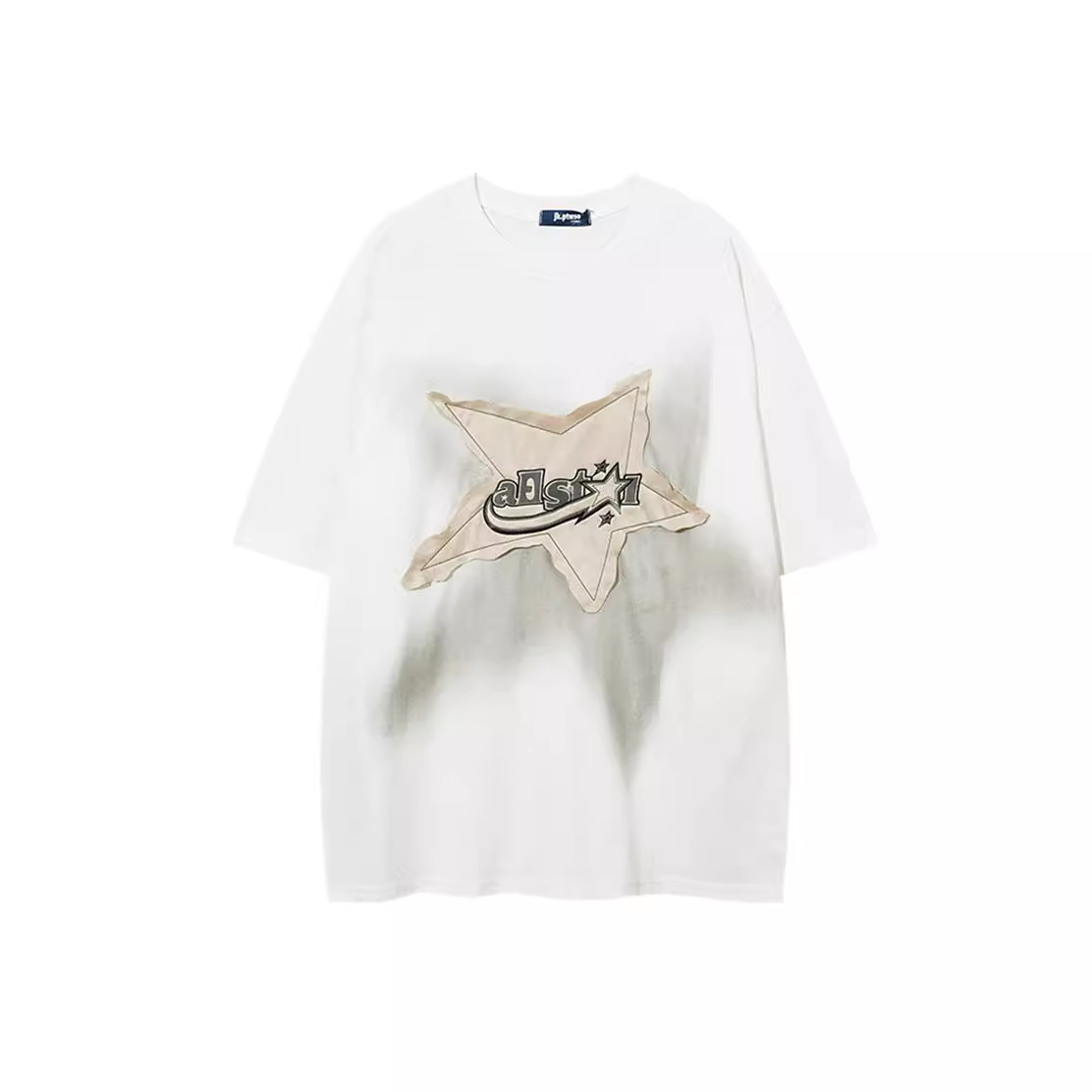 美式星星贴布短袖T恤男复古嘻哈宽a松bf百搭情侣半袖体恤