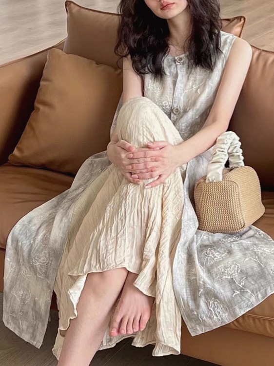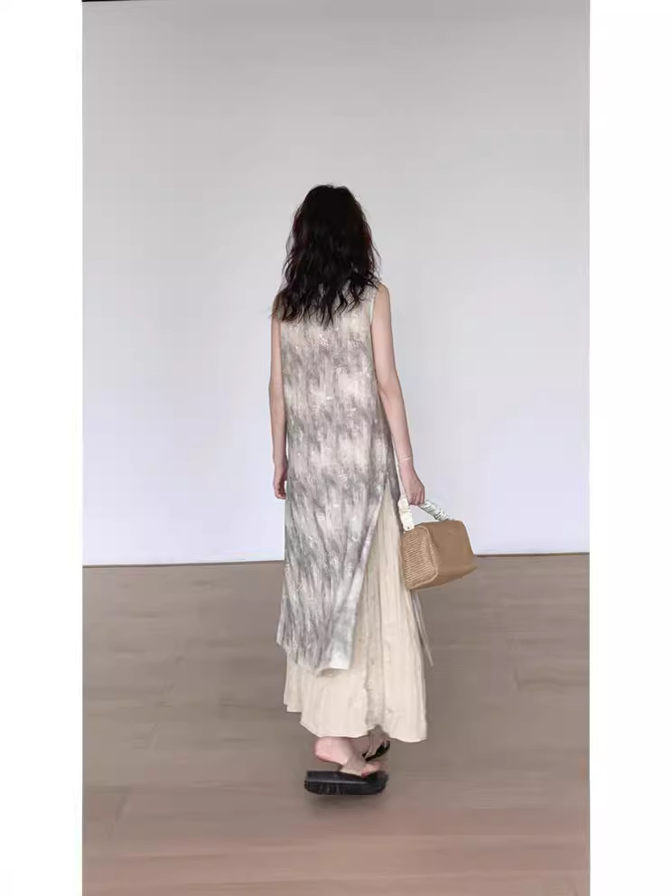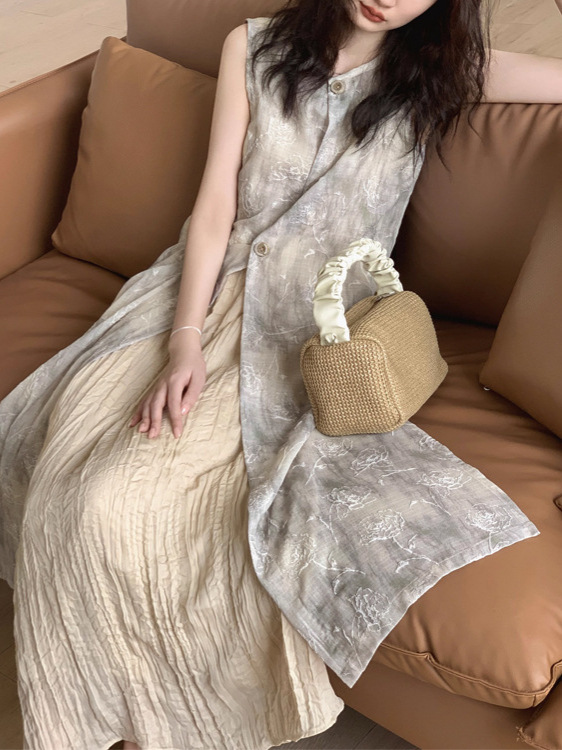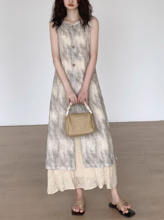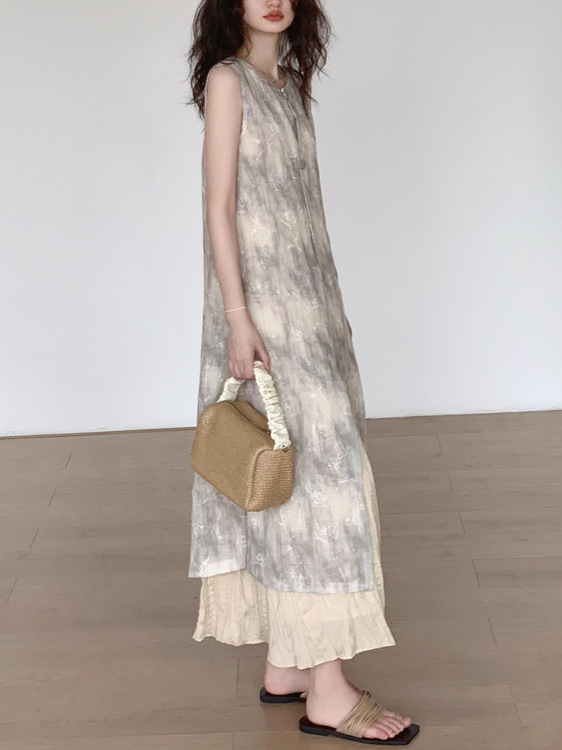 新中式无袖背心裙子女显瘦遮肚子减龄假两件连衣裙夏中长款