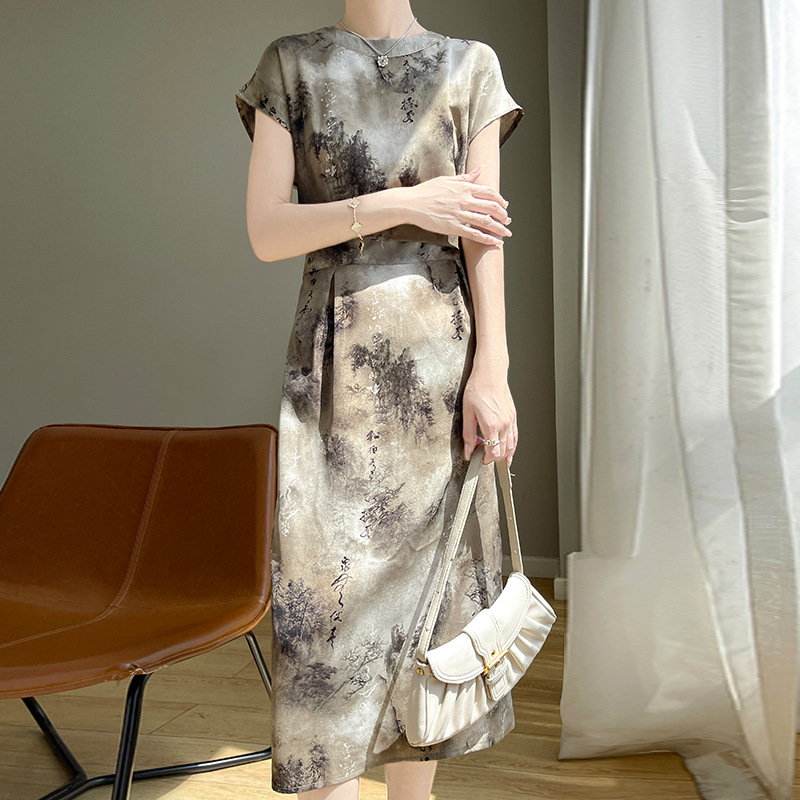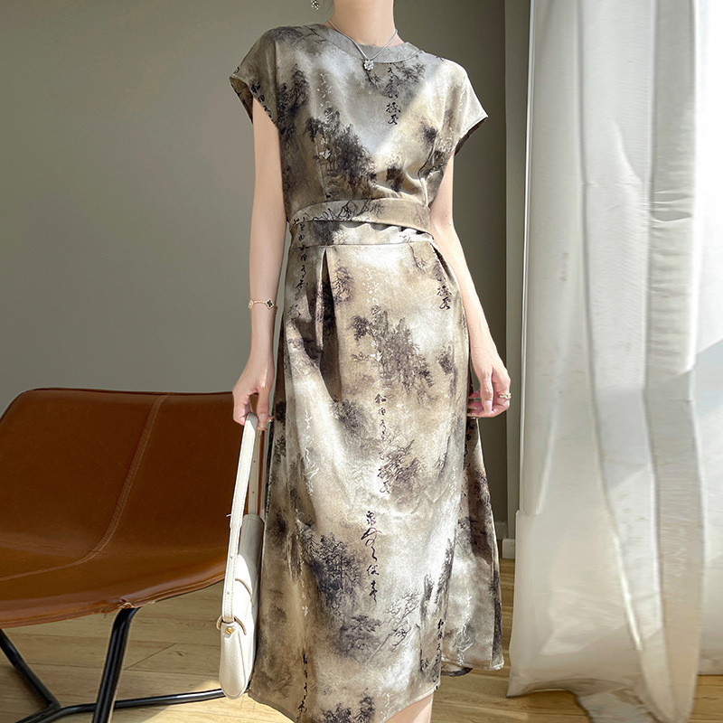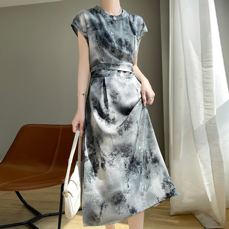 新中式晕染水墨花短袖旗袍裙女醋酸缎面气质复古国风连衣裙