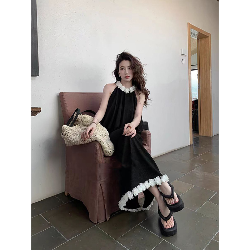 手工立体花瓣短款无袖背心上衣女小个子黑色半身长裙春夏