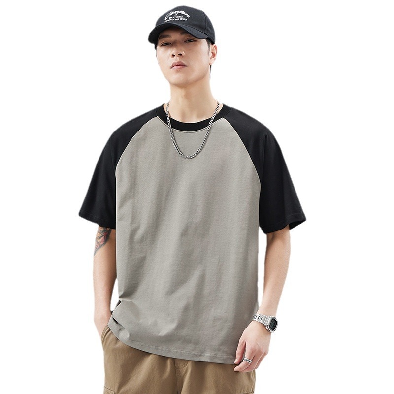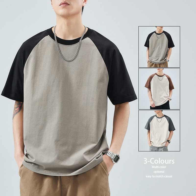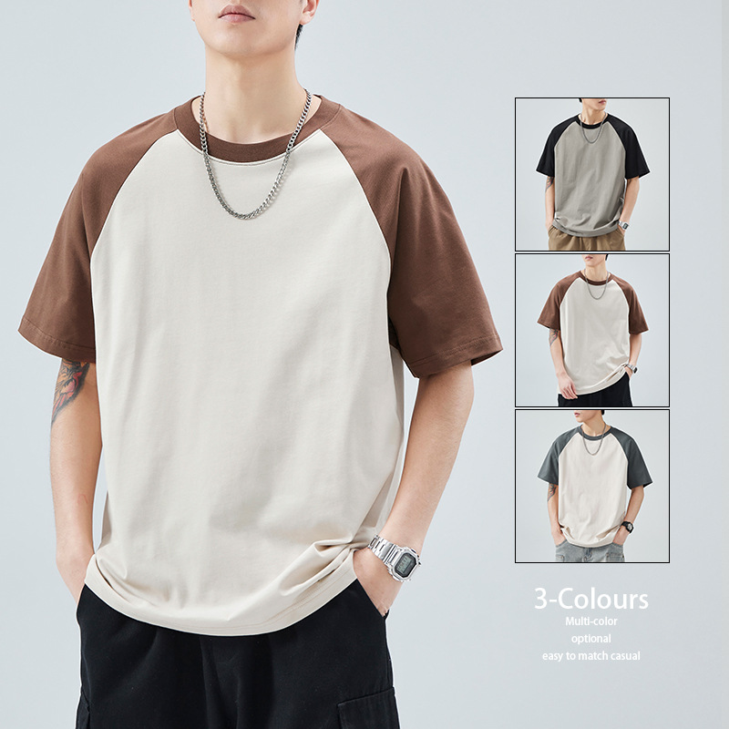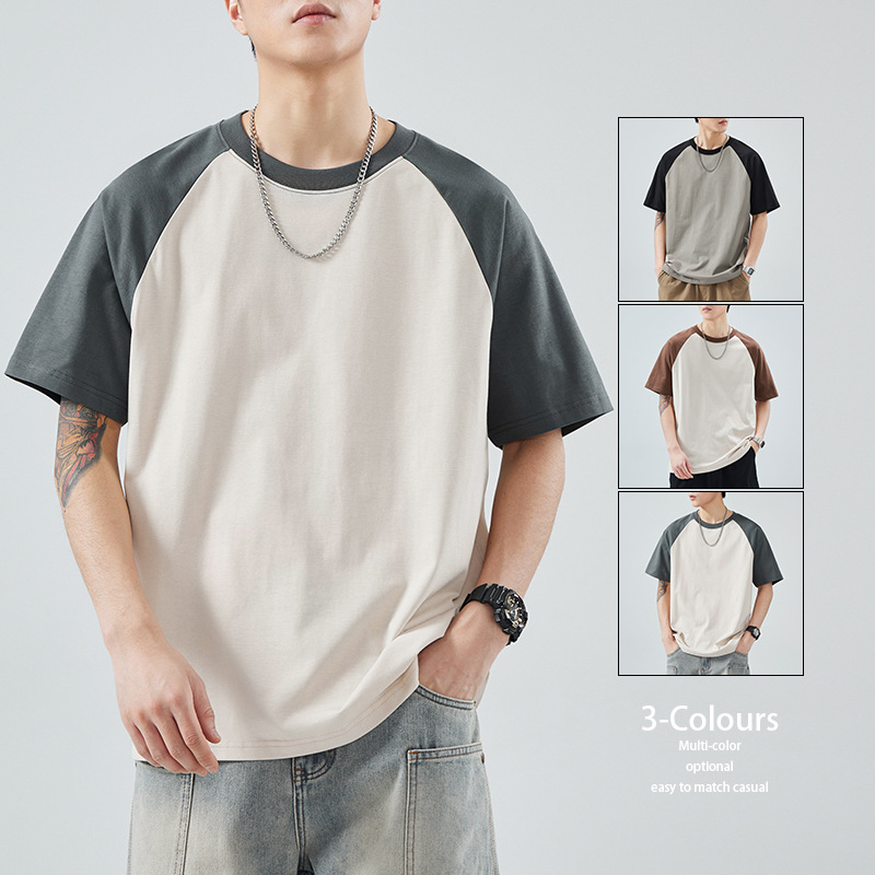 夏季新款潮流宽松拼色插肩纯棉t恤男士时尚百搭轻奢质感上衣男装