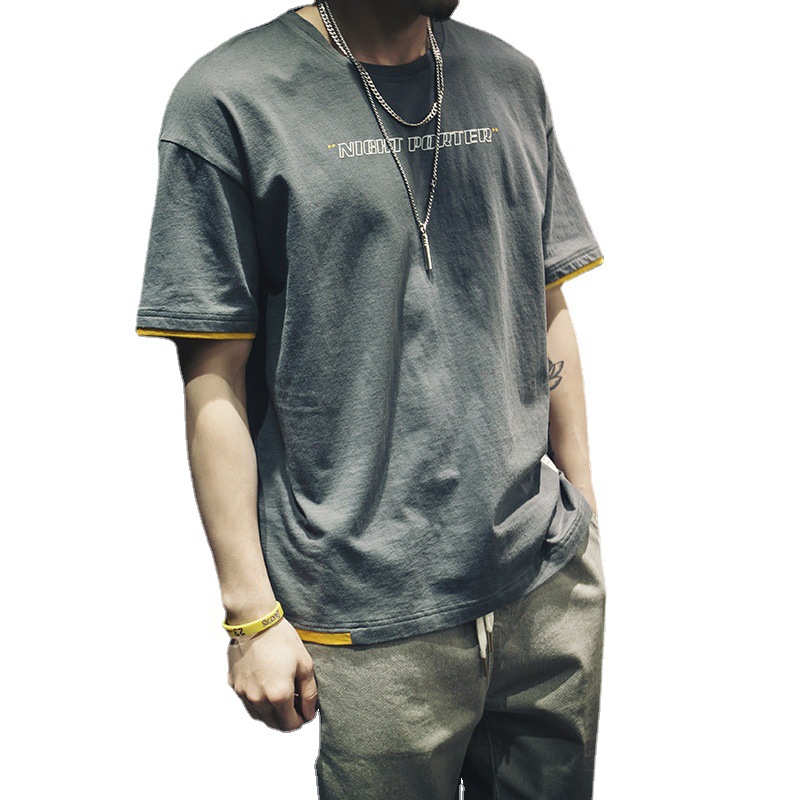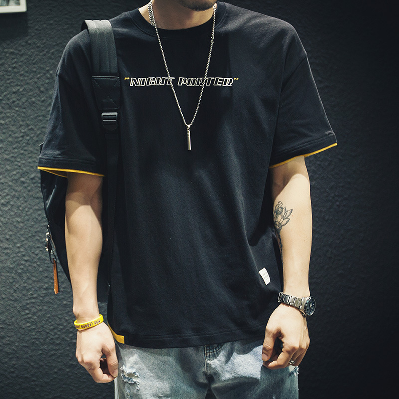 夏季纯棉短袖t恤男宽松潮牌假两件ins半袖大码胖子加肥加大体恤潮
