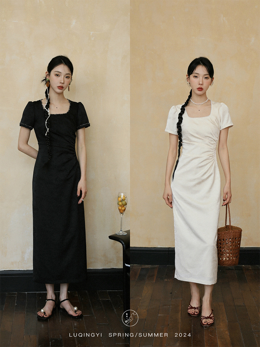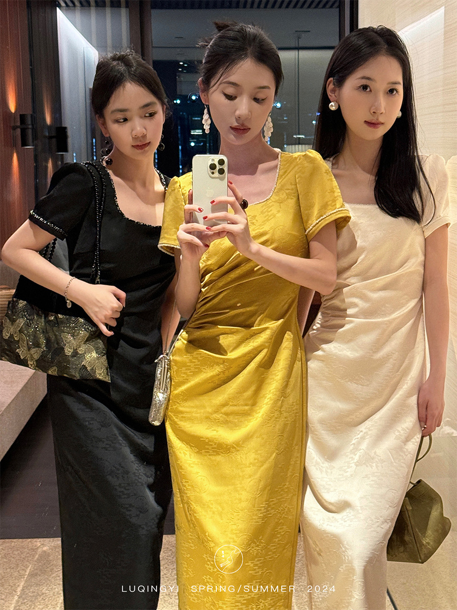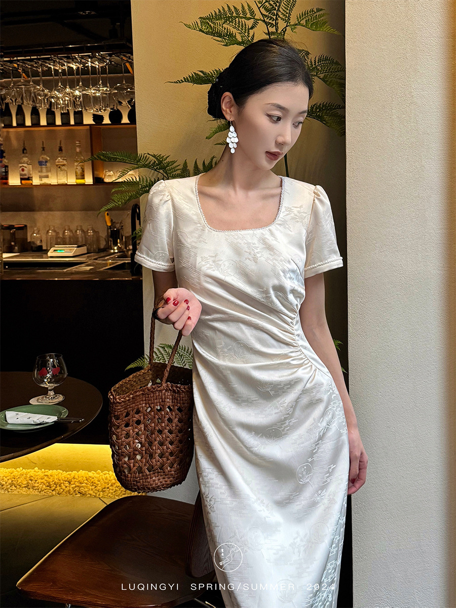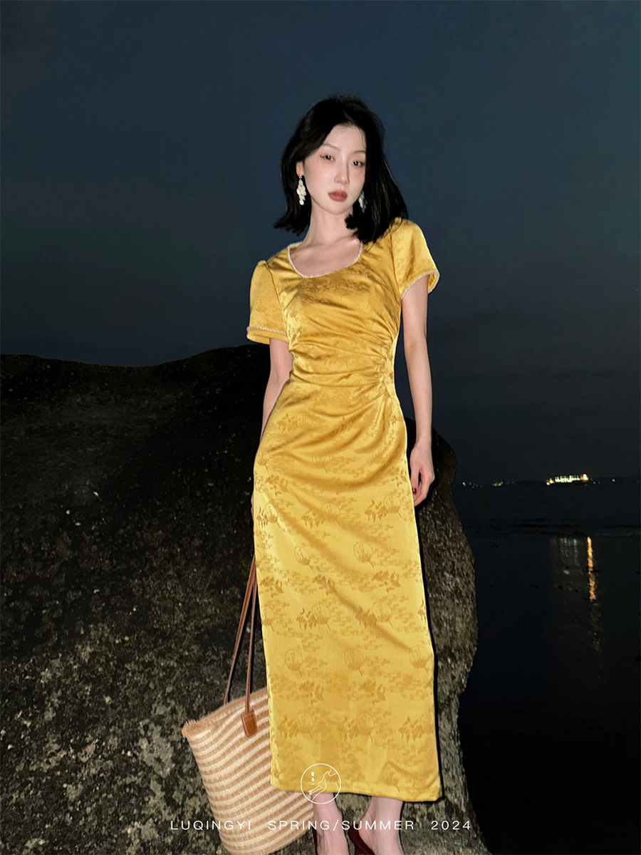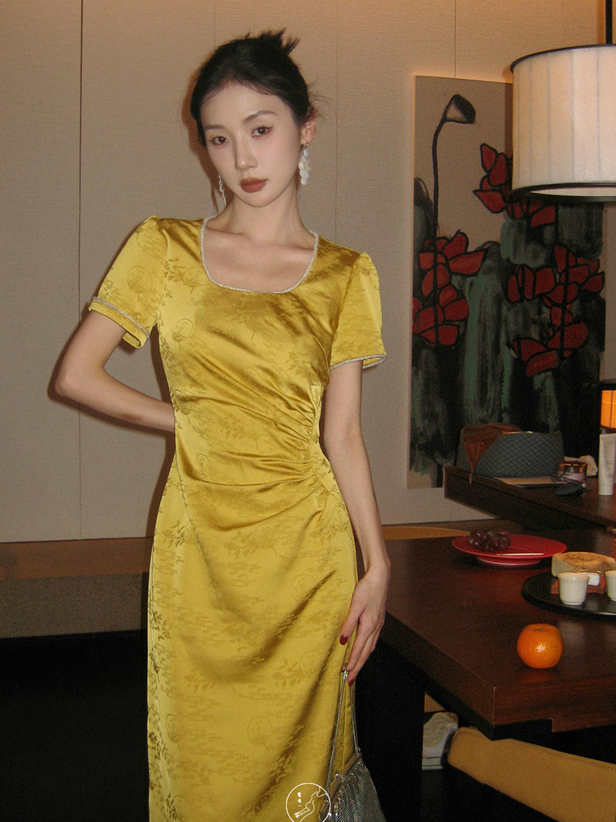 新中式连衣裙女夏捏褶设计复古提花改良旗袍裙