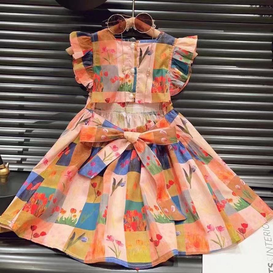 新品女童彩色格子花朵飞袖露背蝴蝶结公主背心裙2025夏装套装