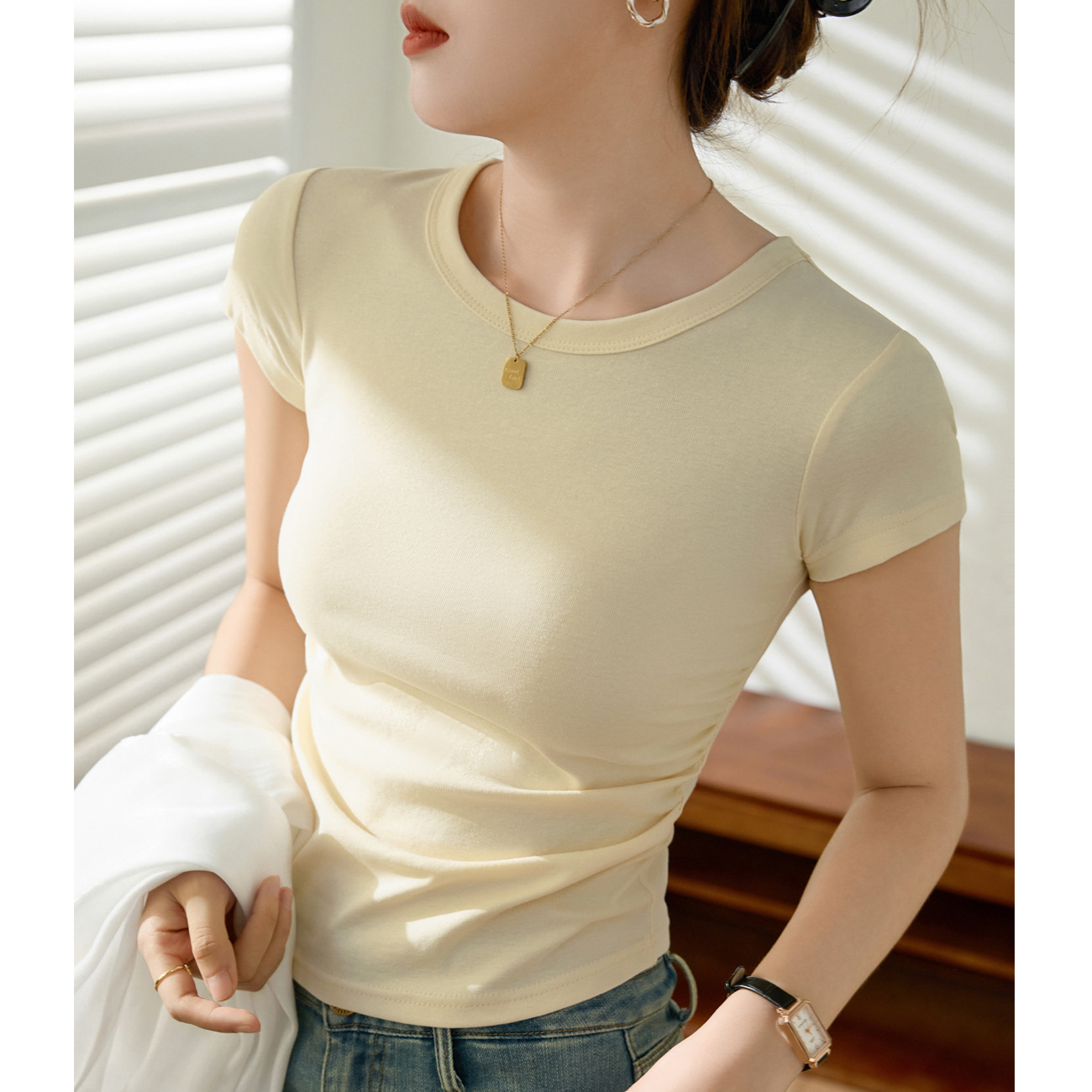【甄选棉】抽褶束腰纯棉T恤女夏短袖2025新款收腰短款显瘦打底衫