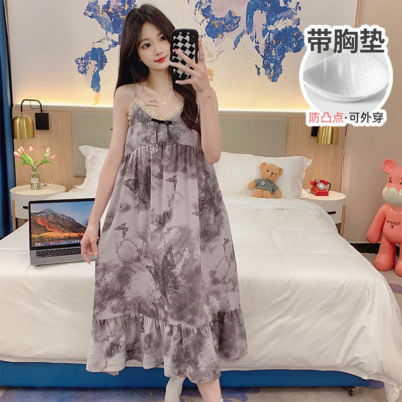 夏季学院风睡裙女薄款蕾丝花边吊带裙带胸垫睡衣韩版宽松休闲睡裙