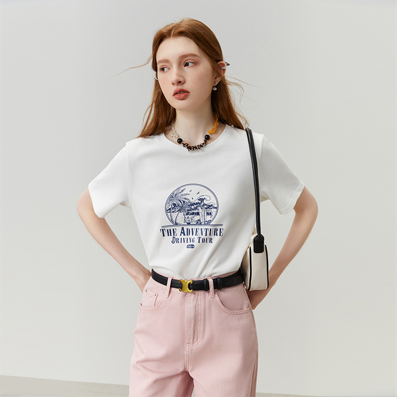 白色印花宽松正肩短袖t恤女新款设计感小众